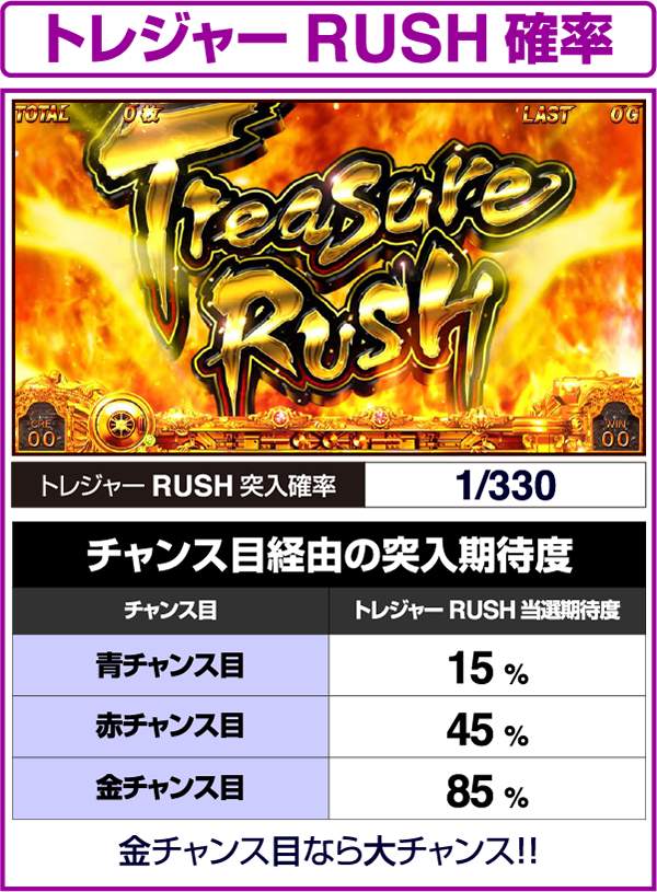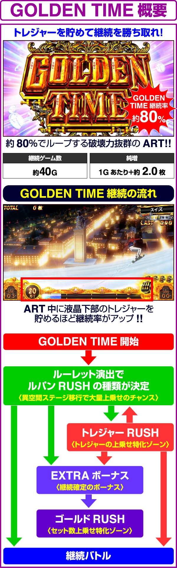 GOLDEN TIME中はいかにトレジャーを貯めて、継続率をアップさせるかがポイント。開始時に選択されるRUSHの種類、内部状態に関わるステージ、そしてチャンス目のヒキが連チャンの鍵を握っている。