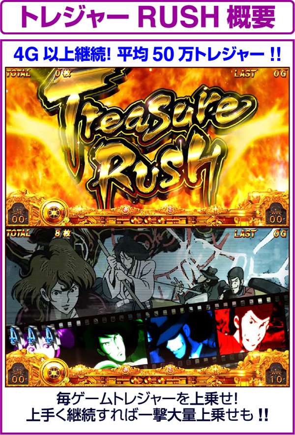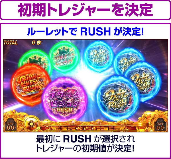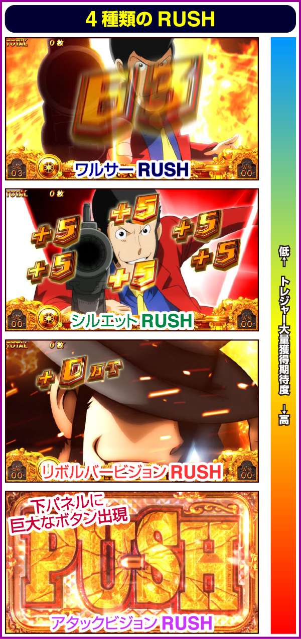 GOLDEN TIMEの初期トレジャーを決定するRUSHの種類は4パターン。不二子が登場するアタックビジョンが選択されればトレジャーがMAX状態からスタートすることも!!