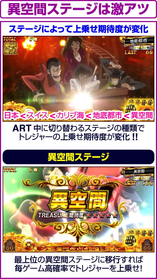 トレジャーの獲得率に関わるステージは4種類あり、GOLDEN TIME中に複数回変化することもある。最上位の異空間に変化すればトレジャーの大量上乗せに期待できる。