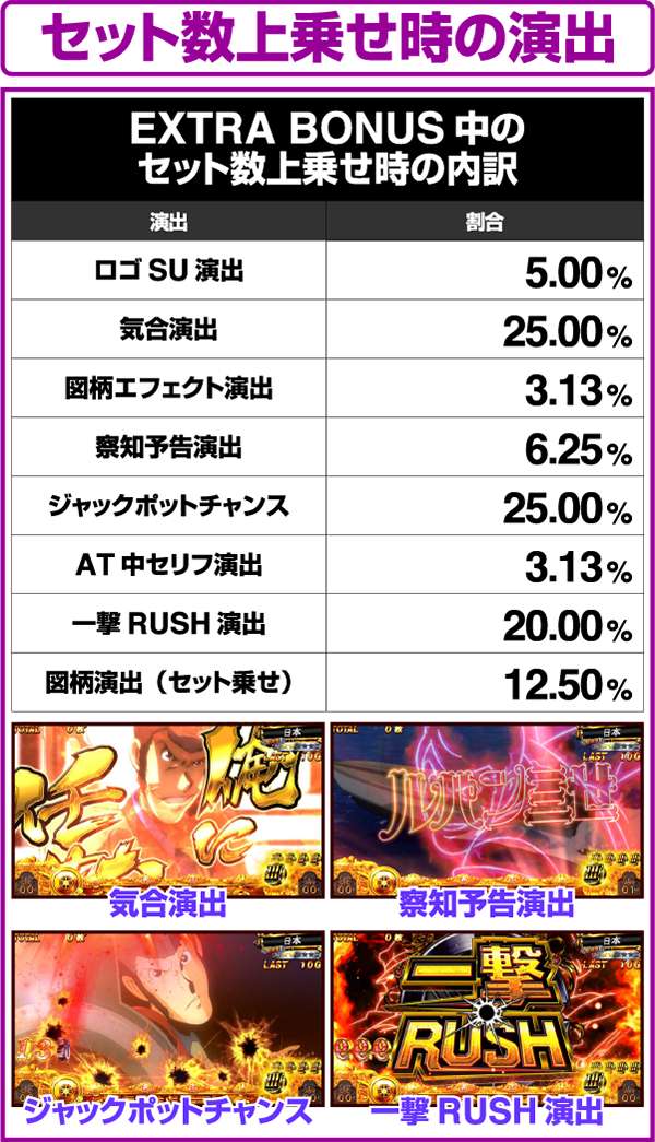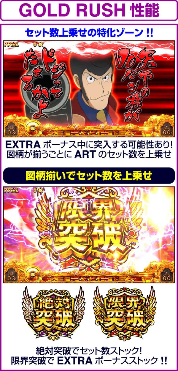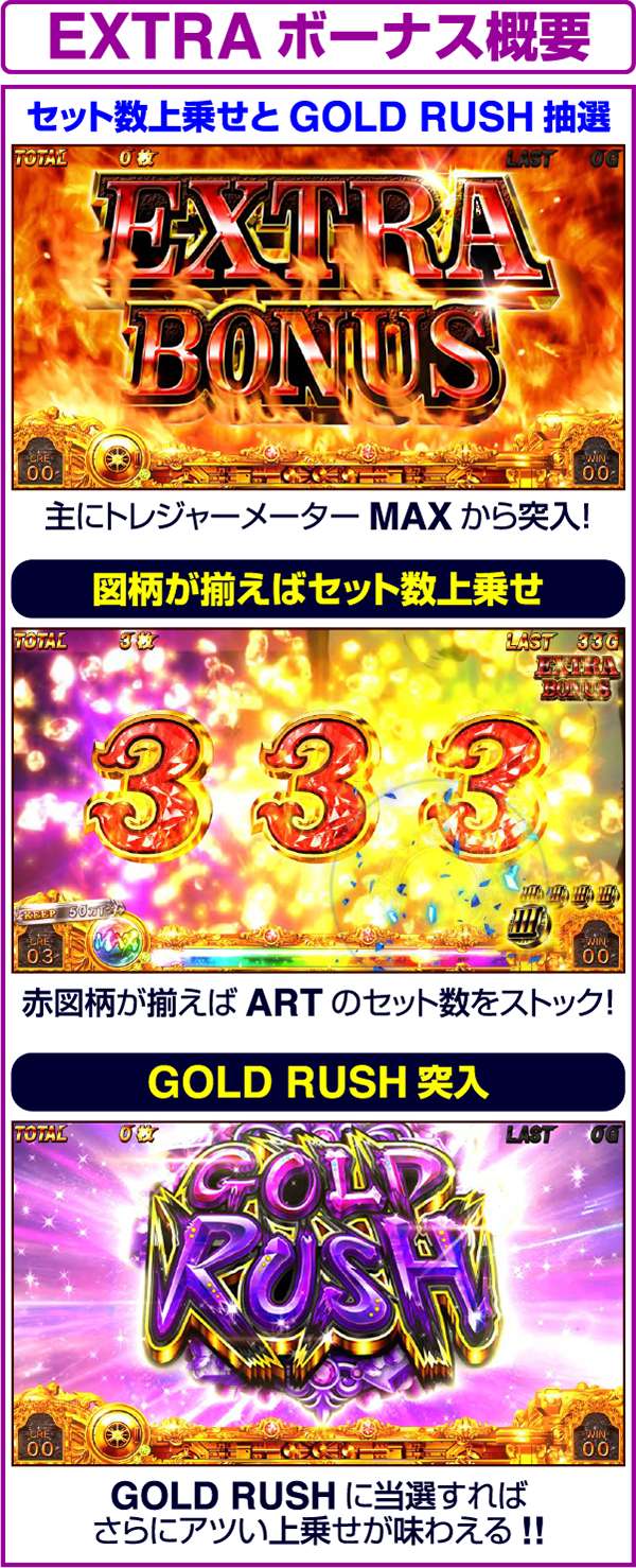 EXTRAボーナス中はARTのセット数上乗せと、セット数上乗せの特化ゾーンであるGOLD RUSHが抽選される。