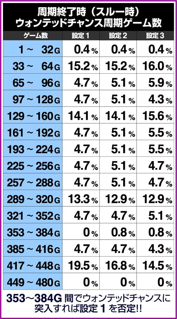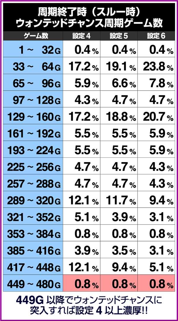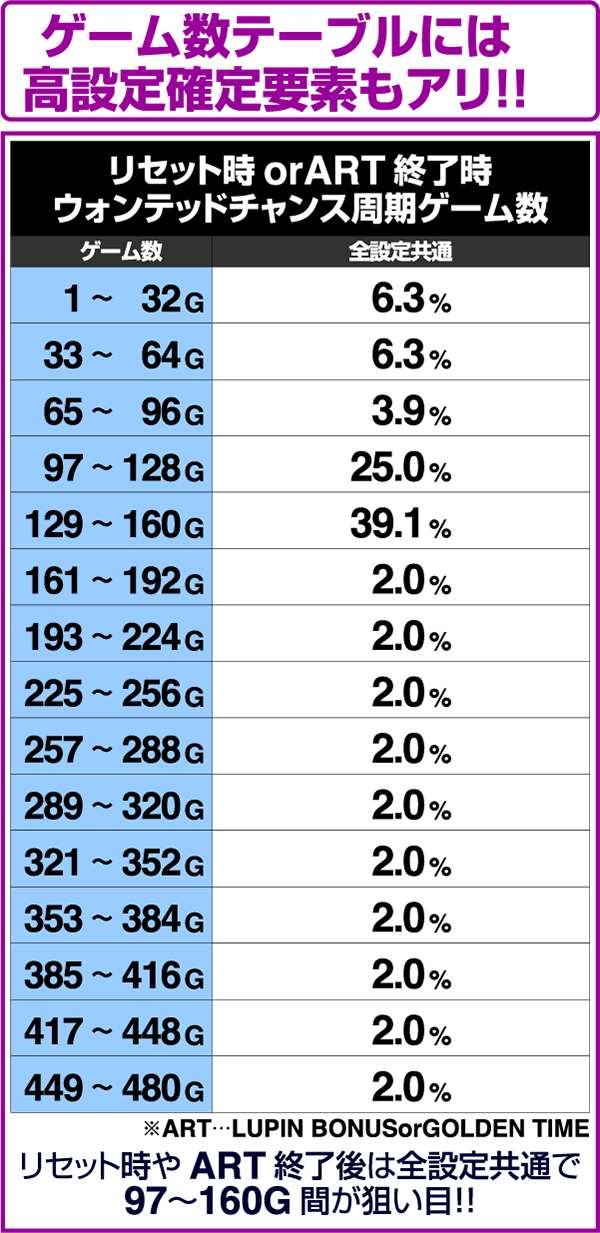 規定ゲーム数に到達してもARTなどの前兆中であった場合は、ウォンテッドチャンスが発動しないため注意しておきたい。