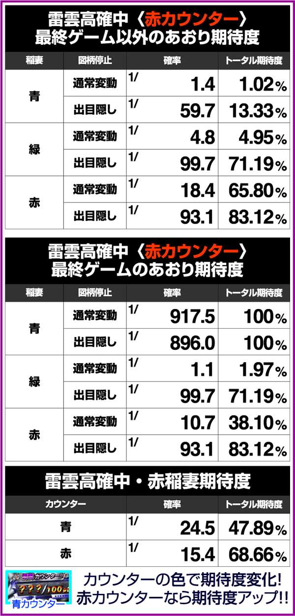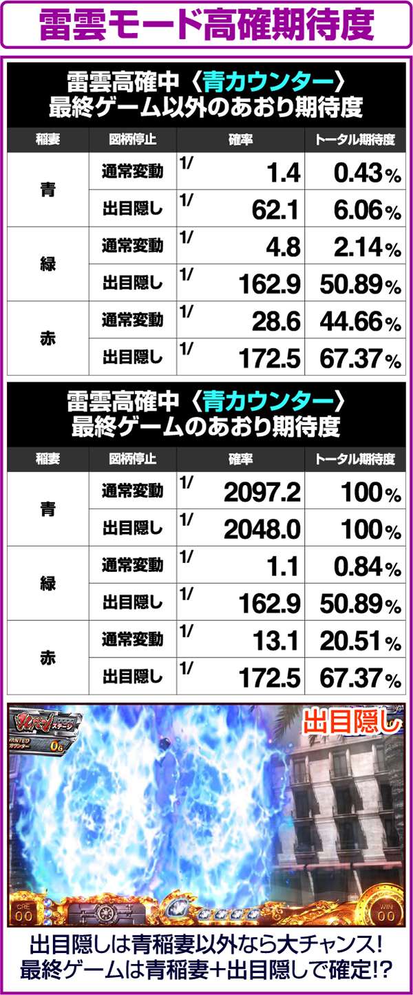 雷雲カウンターがMAXになると7G間の雷雲高確状態に突入。高確状態中に青図柄が揃えば雷雲モード突入となる。