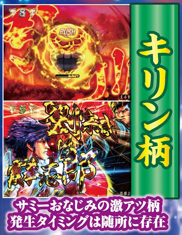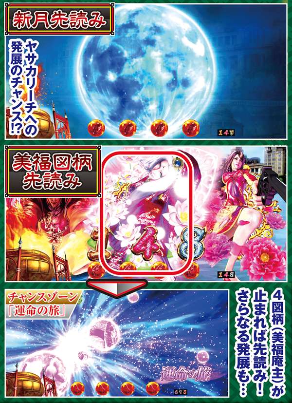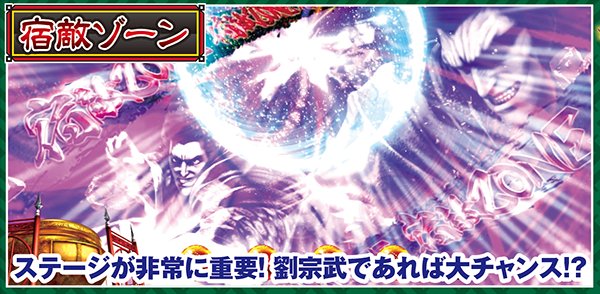 多彩な先読み予告の中でも注目したいのは、発生時のステージで信頼度が変化する宿敵ゾーン。劉宗武のステージなら大チャンスとなる。その他、4図柄停止がチャンスゾーン突入契機となる美福図柄先読みなどにも期待だ。