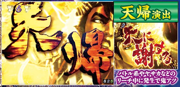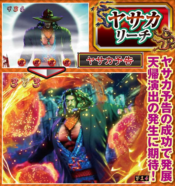 ヤサカ予告から発展する独立系統のリーチ。バトル系と同様に、天帰演出の発生で一気に激アツとなる!