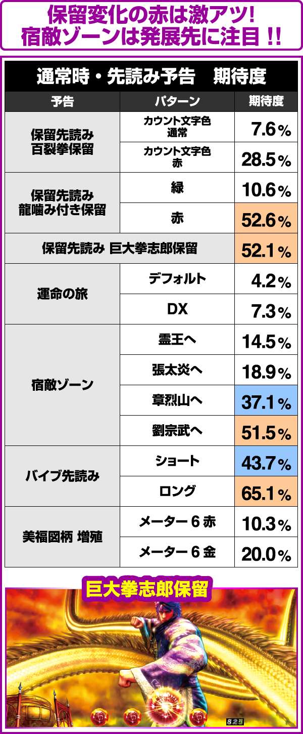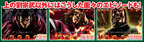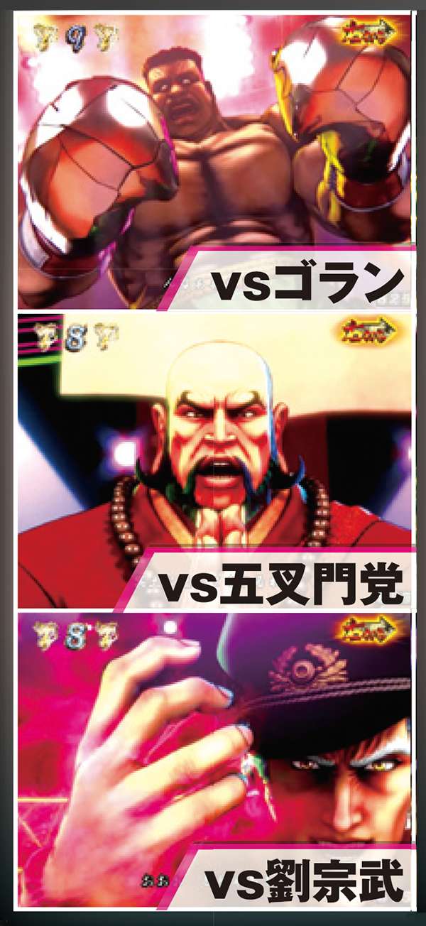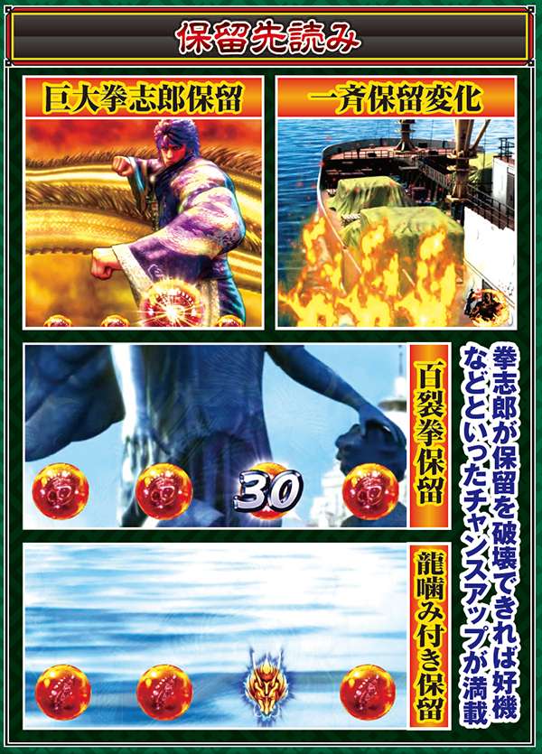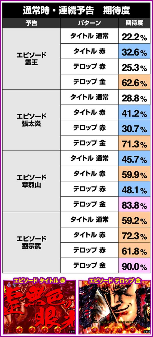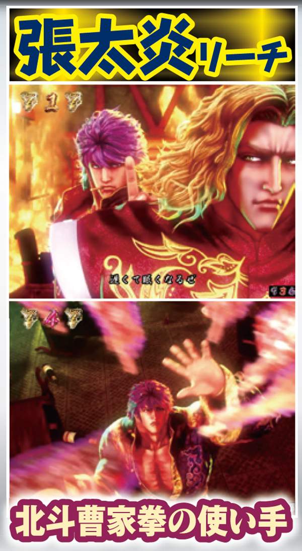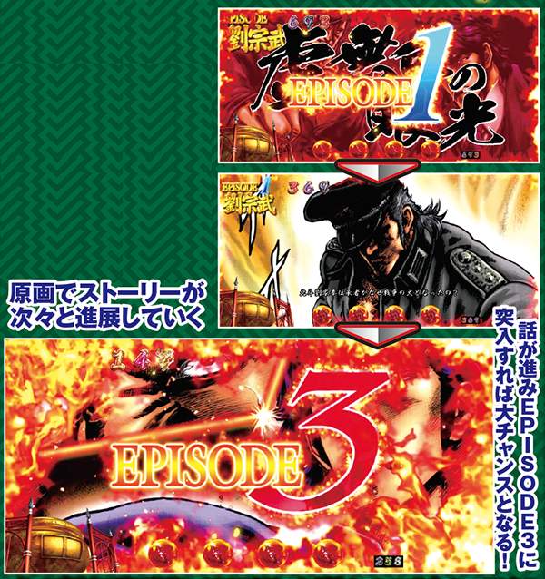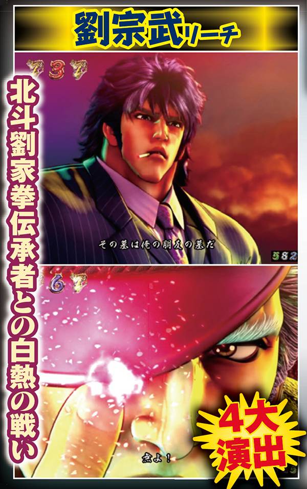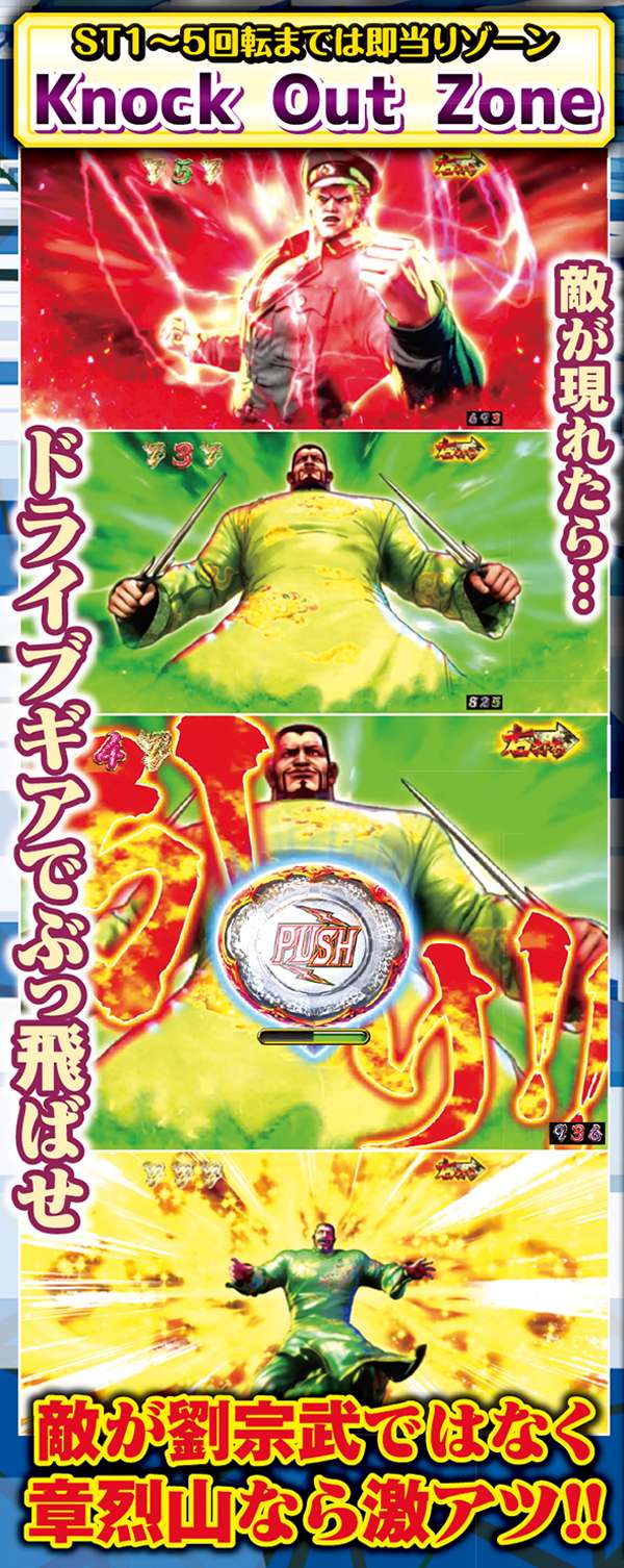 劉宗武を筆頭とする拳志郎の宿敵たちのエピソードが、美しい原画と併せて展開される連続予告。継続するほどストーリーが進展し、3連目のEPISODE3に突入すればビッグチャンス到来となる。連続回数はもちろんのこと、タイトルからエピソード中に至るまで随所にチャンスアップが用意されており、最終的には対応したスーパーに発展する。