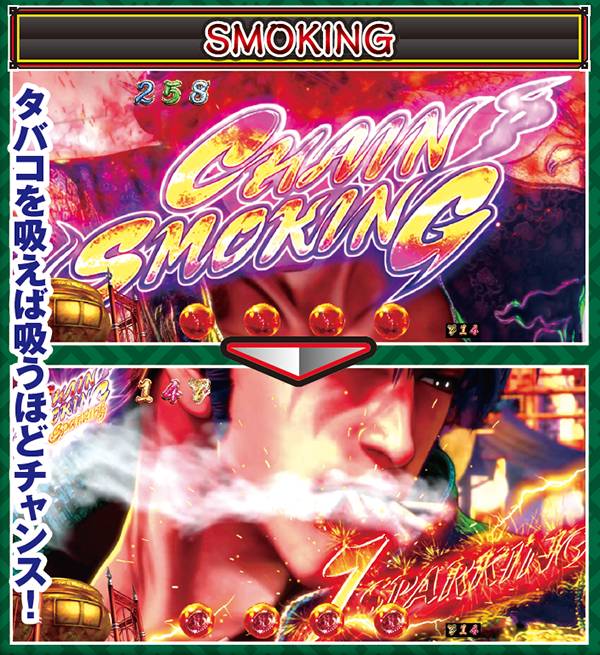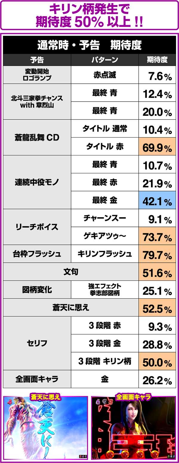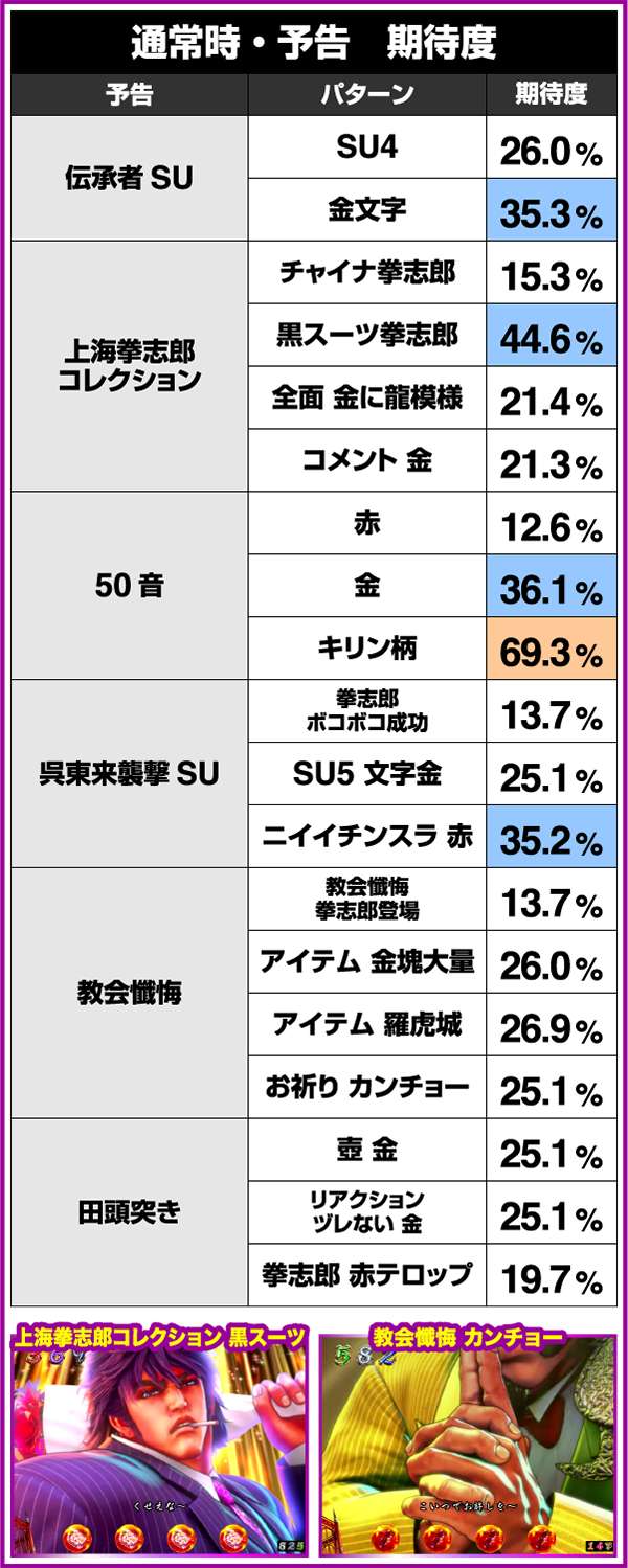 文句予告以外にも様々なチャンスアップが存在する連続予告。図柄乱舞や拳志郎が悪人どもをブッ飛ばす悪倒RUSHなど、注目演出は多い。
