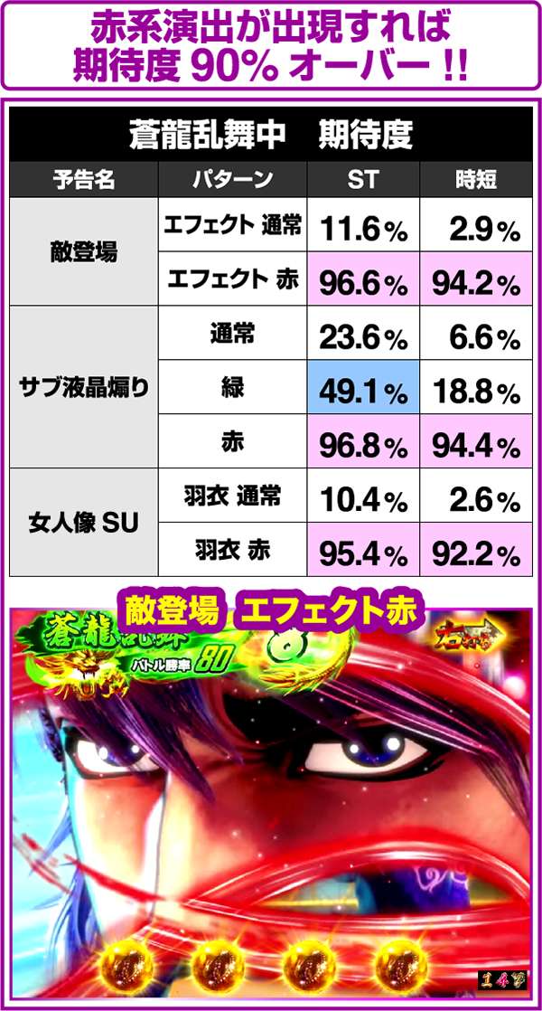 通常時に発生すれば信頼度が急騰するのが上記の4大演出。また、バトル系の他に狼・ヤサカ・蒼龍乱舞・弱敵・ヒロイン・ロングなどの各種スーパーリーチが存在するようだ。