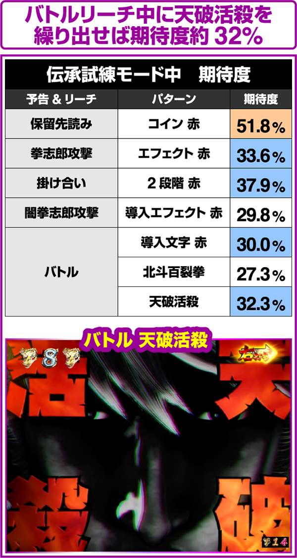 最初のST5回転で当たらなかったらこちらへ。対戦相手や多彩な先読み予告など、『蒼天の拳』の世界観溢れる演出が堪能できる。