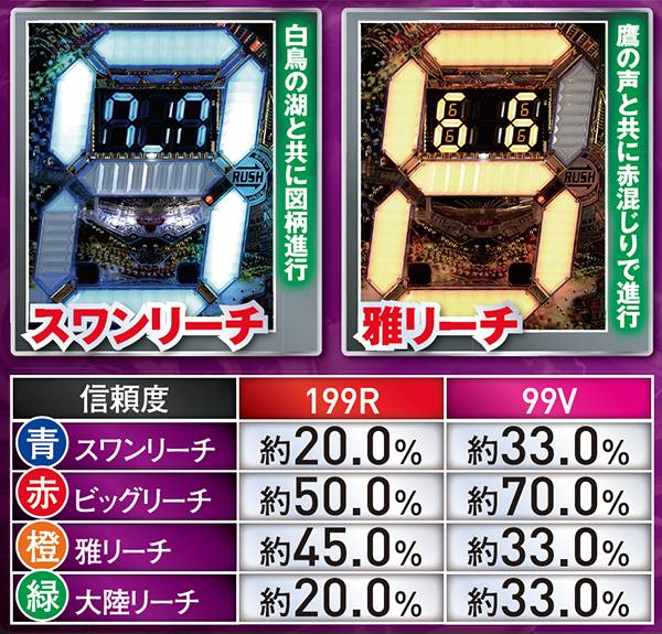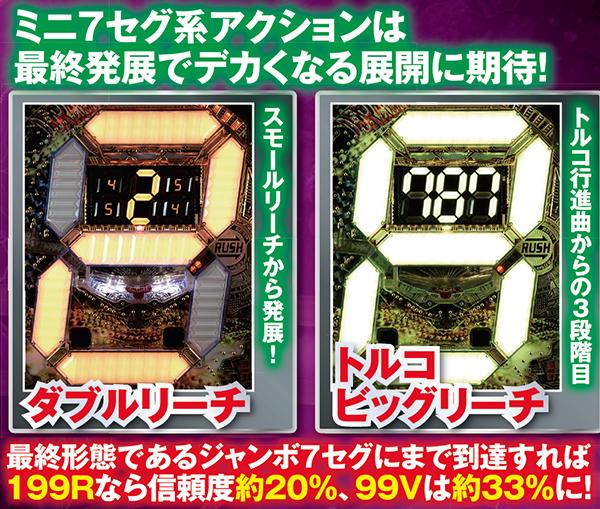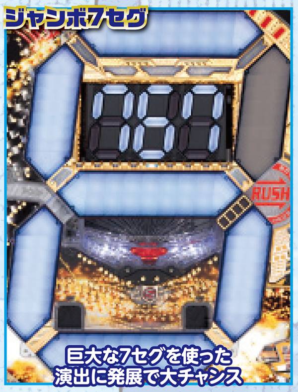 豊富に存在するリーチの中でも最終系であるジャンボ7セグで展開されるアクションになれば期待できる。各リーチで動きは異なるが、BGMとして流れる楽曲やセグの色で判別は可能。中でも赤色で進行するビッグリーチ期待大!