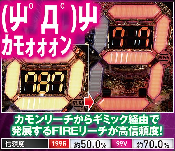 出現しただけで信頼度が跳ね上がる新搭載のFIREギミック。テンパイ直後をはじめ、リーチ中などに出現する可能性があるため、いかなる状況下でも大当りの期待を抱くことができる。また、カモンリーチ中に出現すれば、本機最強のFIREリーチに発展する!