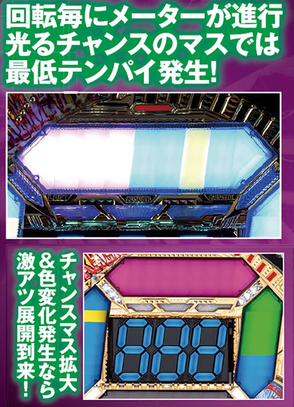 ジャンボ7セグがメーターとなり、保留先読みのような演出を発生させる。黄色く光った部分は大当りへの期待が持てる。