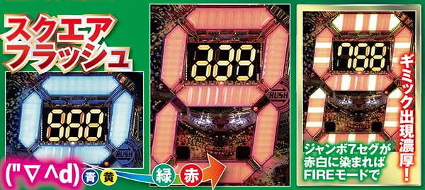 通常時に発生するスクエアフラッシュは、順目といったチャンス目が停止すると色が昇格。また、赤白が混じるとFIREギミックが出現と、とにかく発光色に注目です。