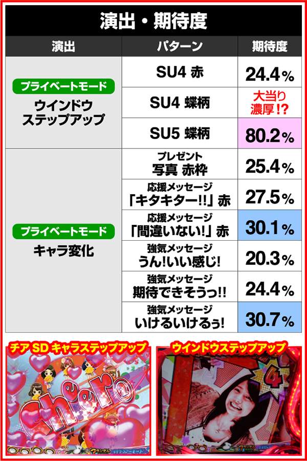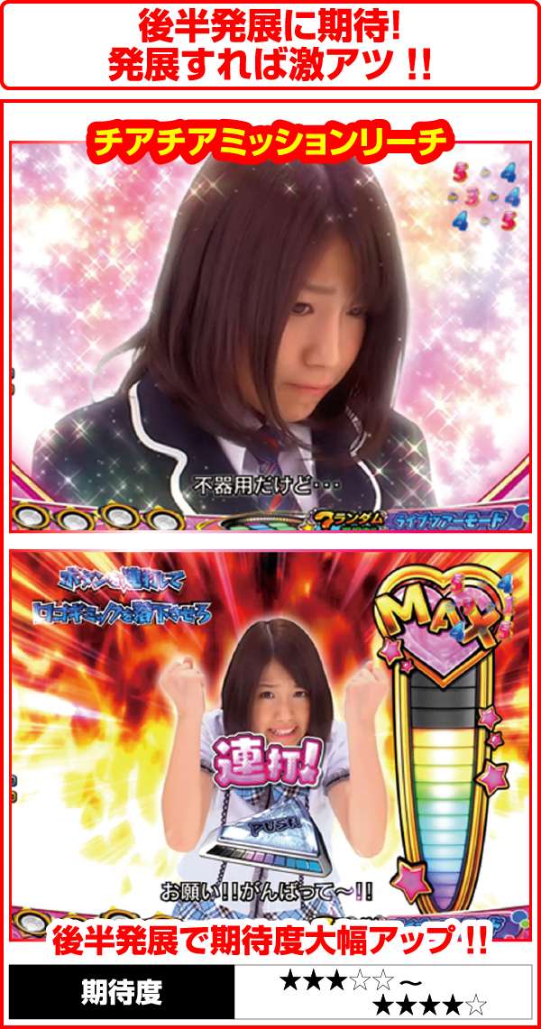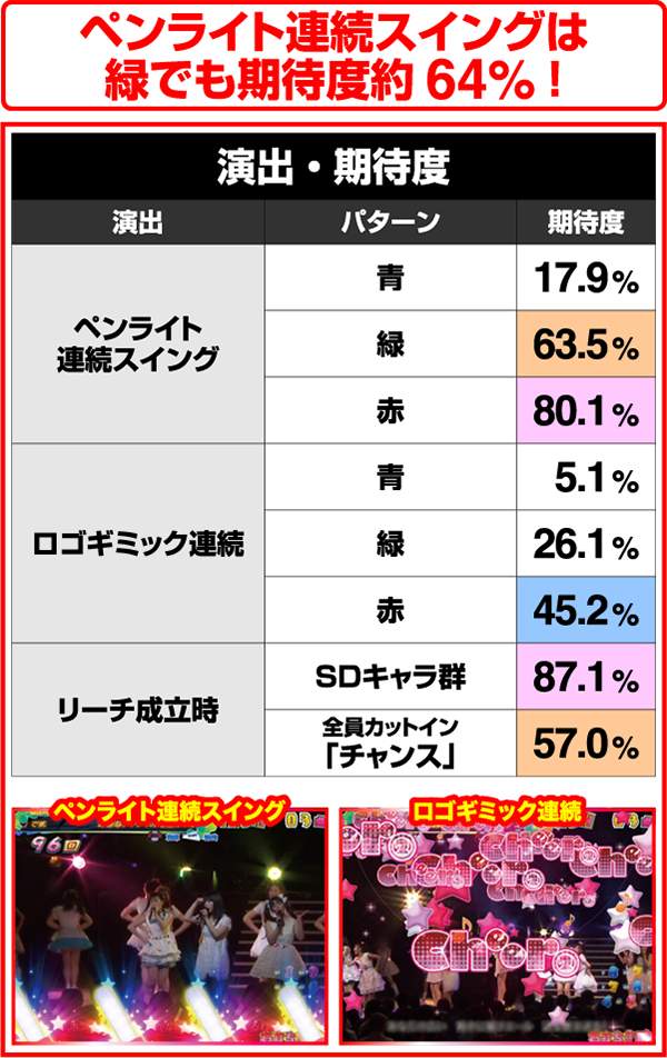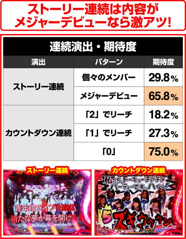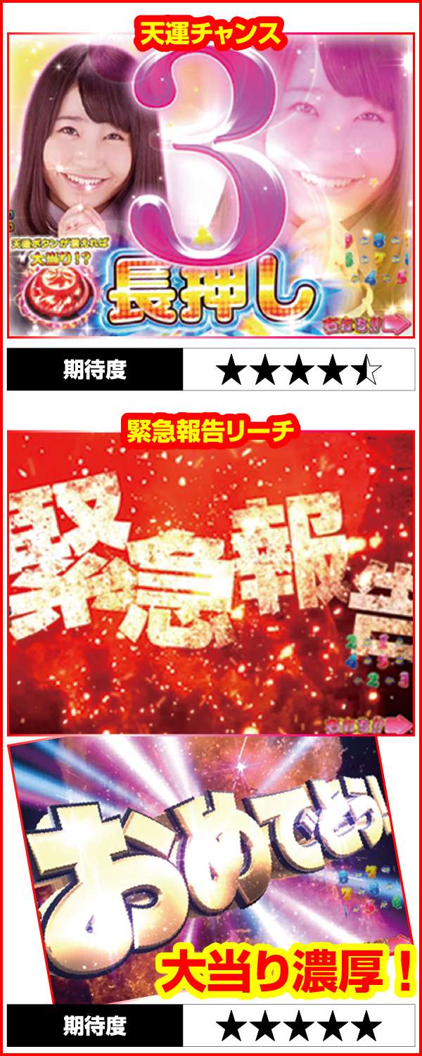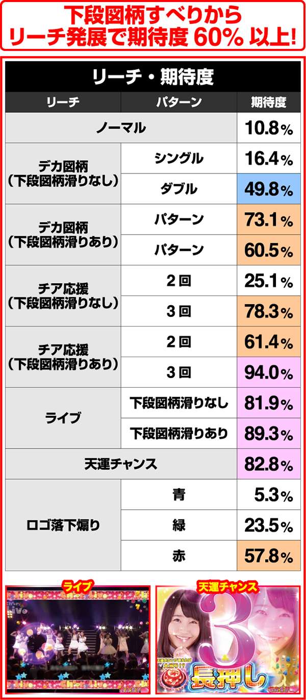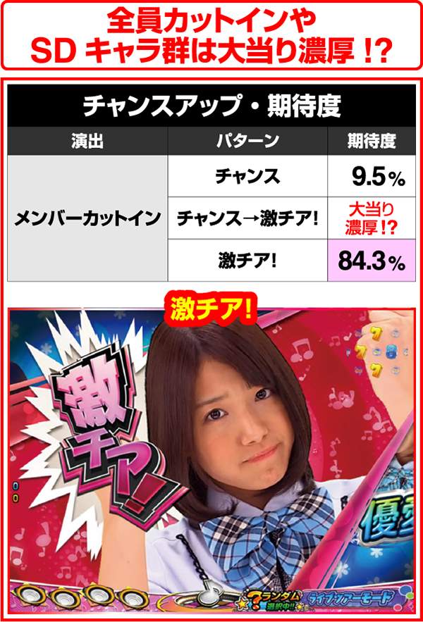 上記のほかにメンバーが固有のアクションで図柄を滑らせる下段図柄滑り連続も存在。成功期待度は約51%だ。