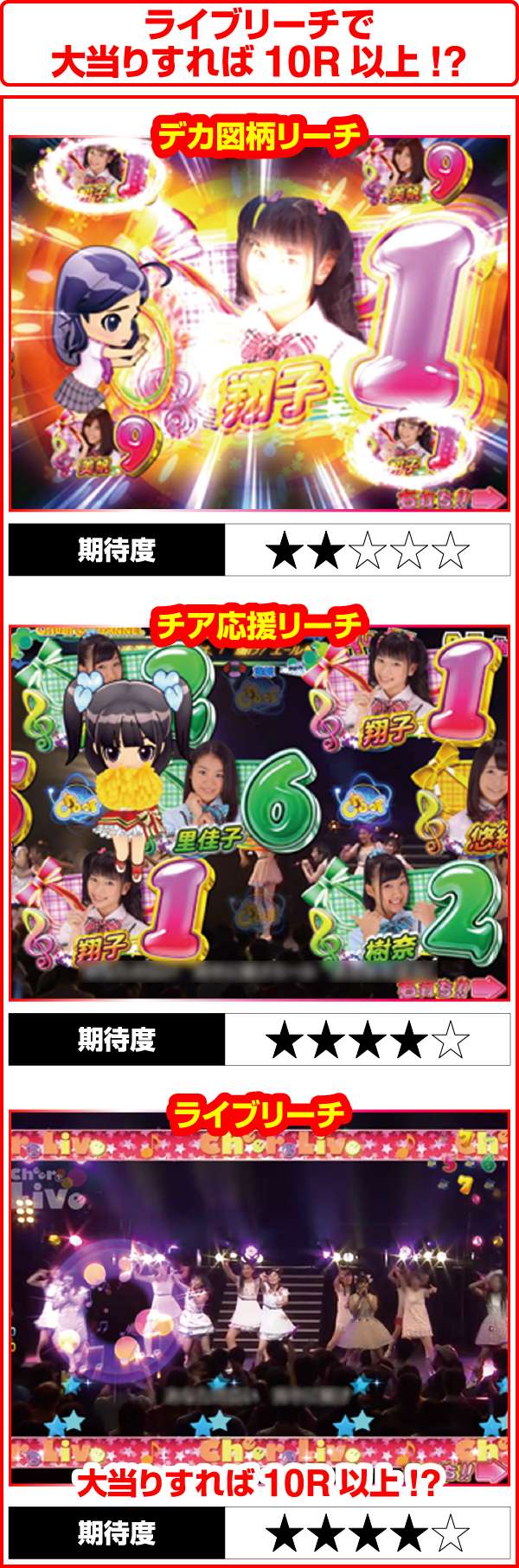 通常時と同様に、ライブリーチは発展した時点で激アツ。大当りすれば10R以上といった特徴も持つ。