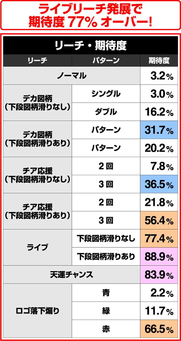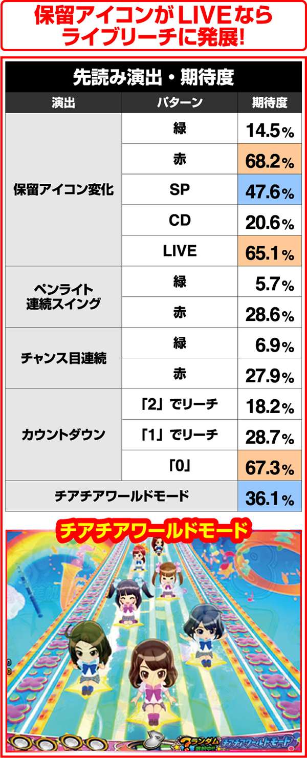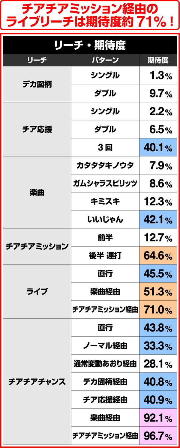 ]ライブとチアチアチャンスは発展経路によって期待度が大きく変化。直接発展するよりも、ほかのリーチを経由して発展したほうが高期待度となる。チアチアミッションから発展した場合はどちらも激アツだ!