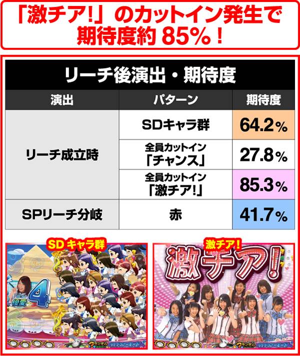 リーチ中にカットインが発生した場合は、「激チア!」に期待しよう。また、全員カットインやSDキャラ群が出現した場合は、安心してその後の演出を楽しもう!