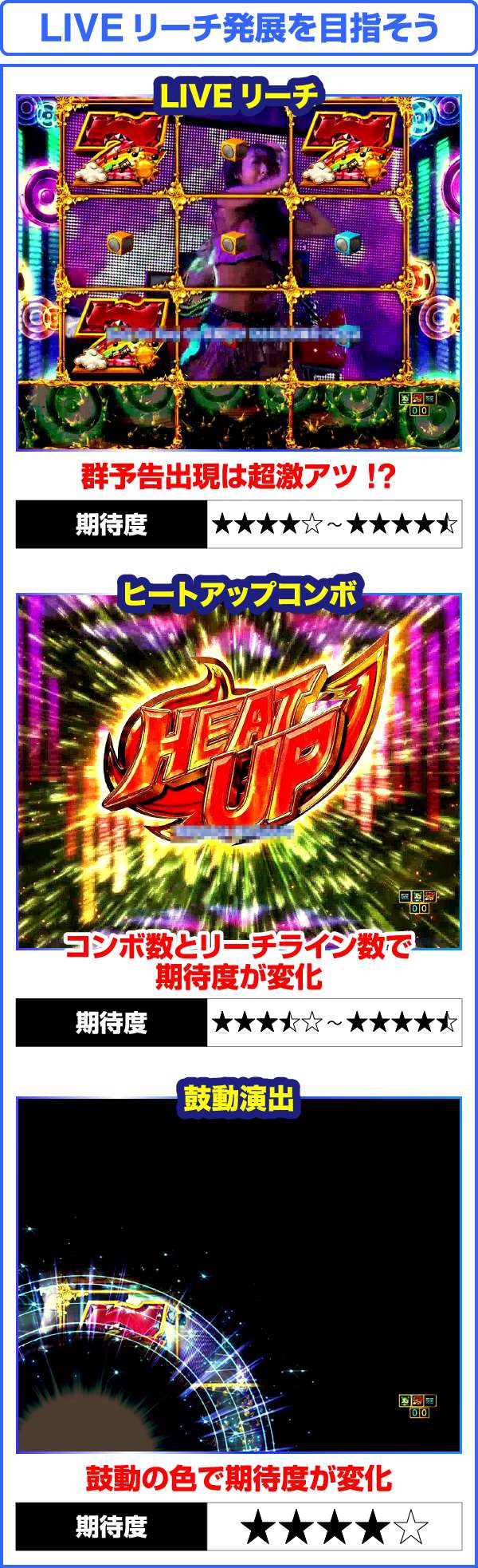 LIVEリーチではリーチ最後のあおりに注目。ボタンが出現すればチャンスアップで、ブラックアウトすればドックンあおりが発生とアツい。