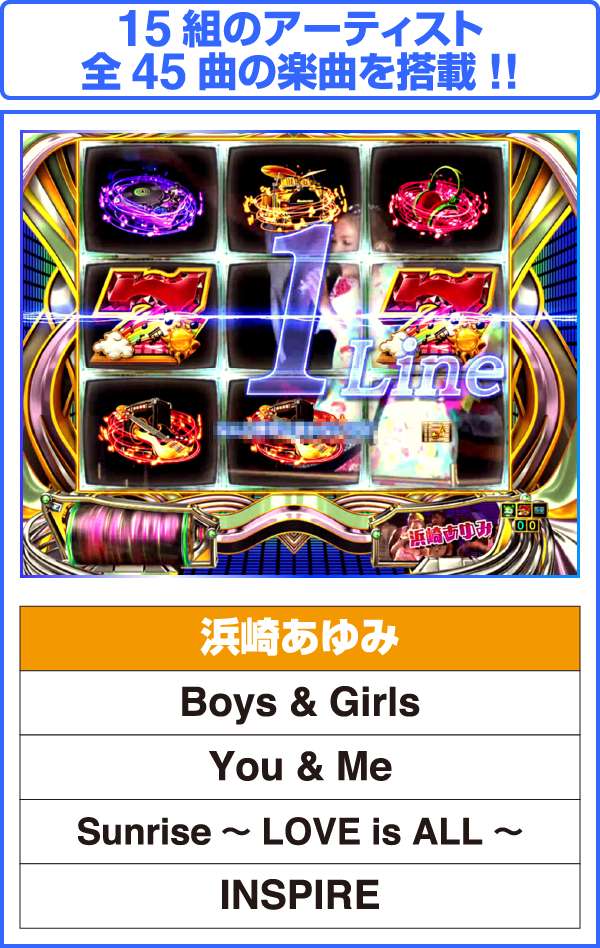 特にチャンスとなるのが「ミュージックライブゾーン」と「アーティスト登場予告」で、出現時は大当りに期待してよし!!