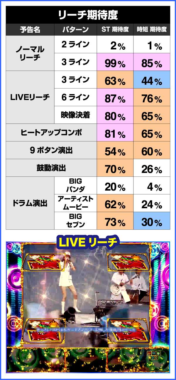 前兆予告で大当りの大チャンスとなるのはゾーン系。特にミュージックライブゾーンは通常パターンでも期待度は約85%と高い数値だ。そのほかの前兆予告の高期待度パターンは上記の通りだ。