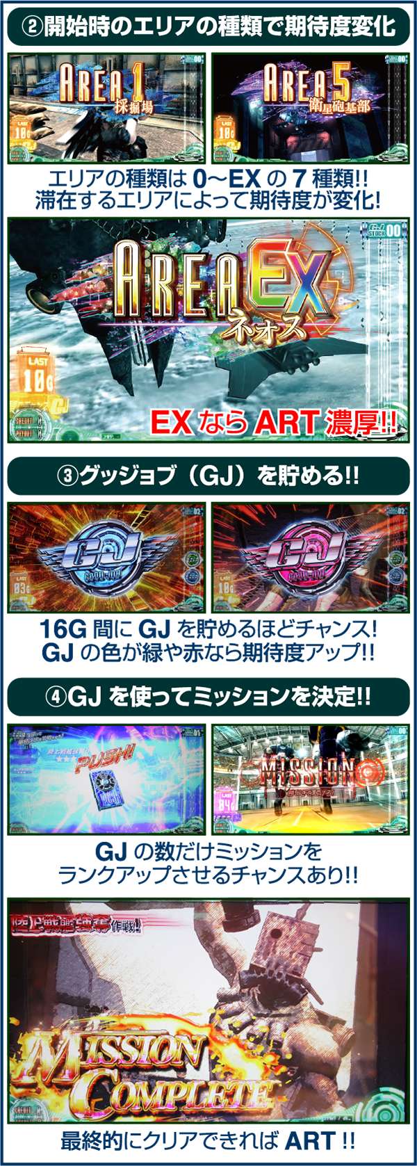 ART当選のメインルートとなるCZは、滞在中にGJを集めるほど期待度がアップ。最終的に集めたGJを使ってミッション演出が決まり、見事、クリアすることができればART突入となる。