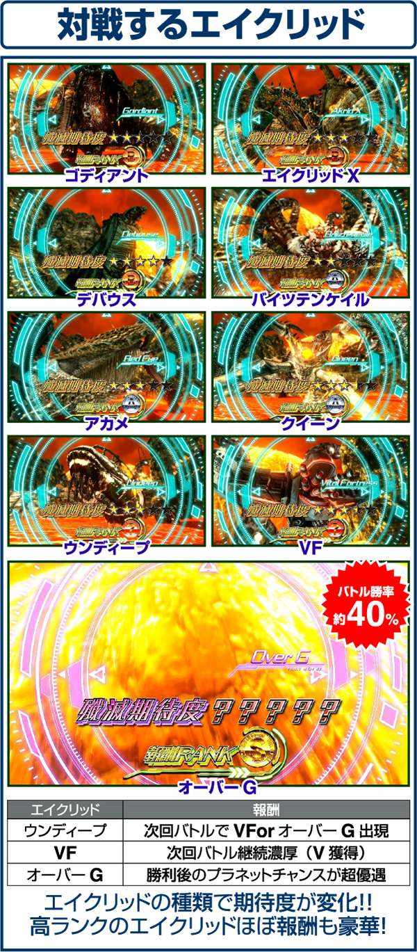 また、エイクリッドによって殲滅時の報酬が異なり、報酬ランクの高いエイクリッドほど殲滅後のプラネットチャンスで多くのT-ENGをゲットできる可能性がある。