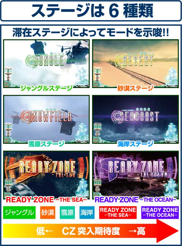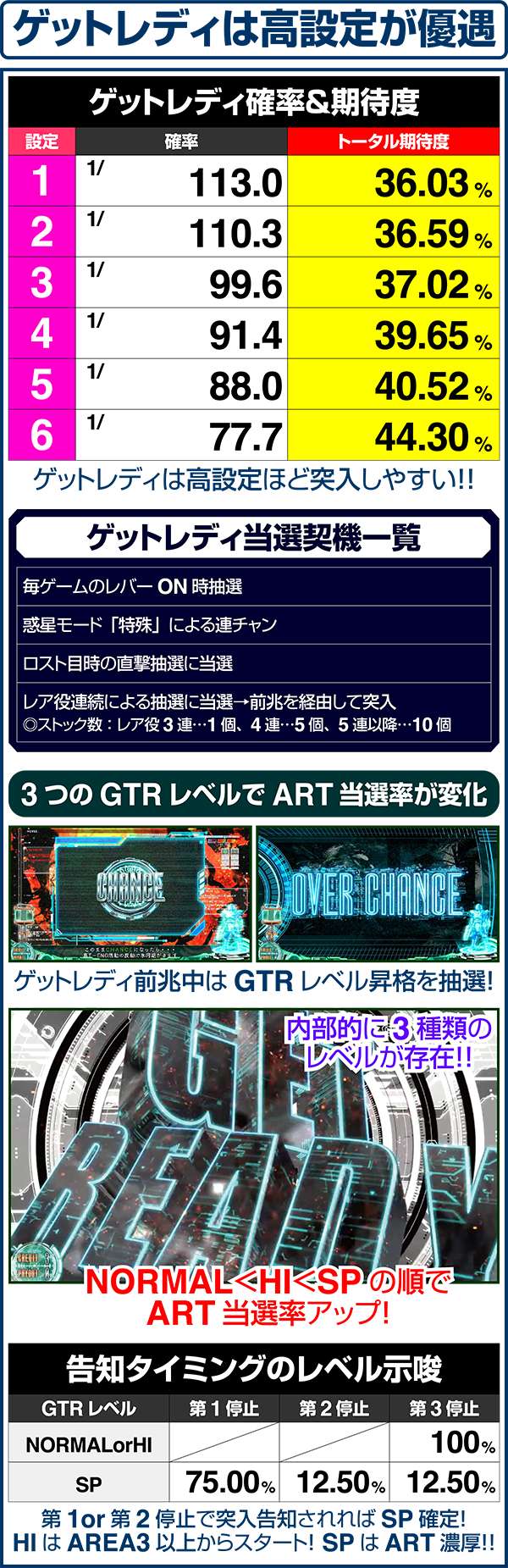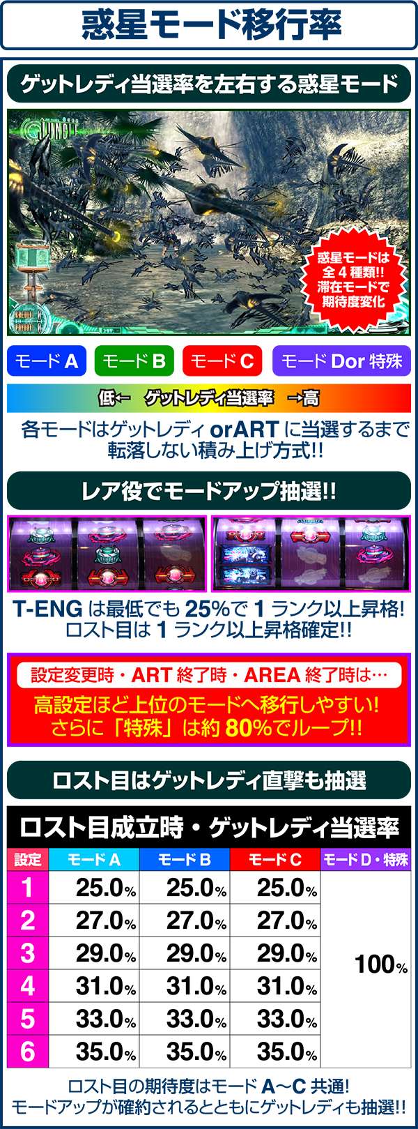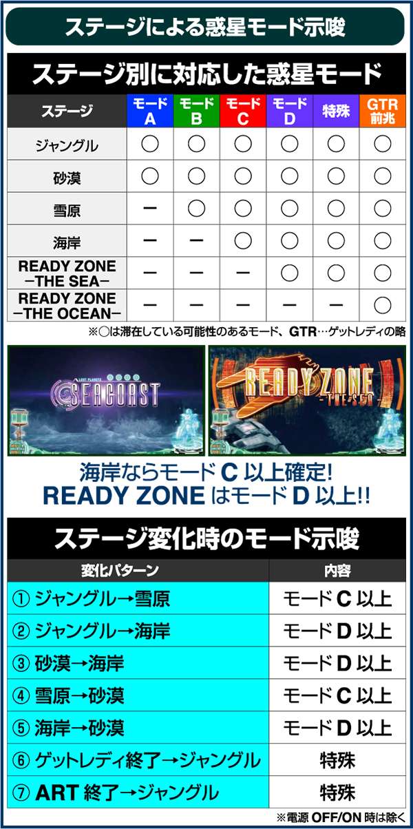 ART当選のメイン契機となるゲットレディの当選率はモードA・B・C・D・特殊という5つの内部状態(惑星モード)によって変化。モードはゲットレディorARTに当選するまで転落する可能性がないため、1度でも海岸以上のステージに移行すれば上位のモード濃厚となる。READY ZONEはモードD以上確定となるため、ゲットレディorARTに当選するまで続行するのがベターだ。
