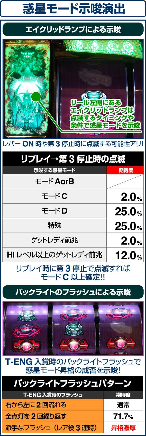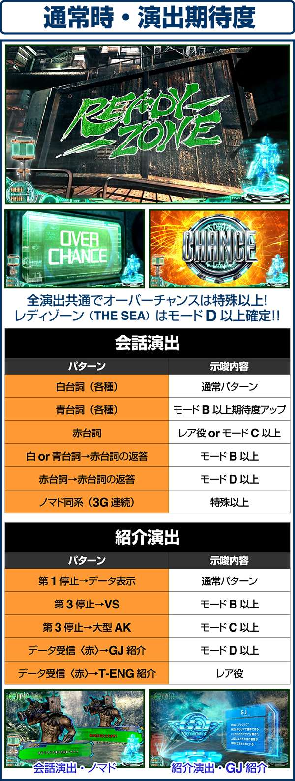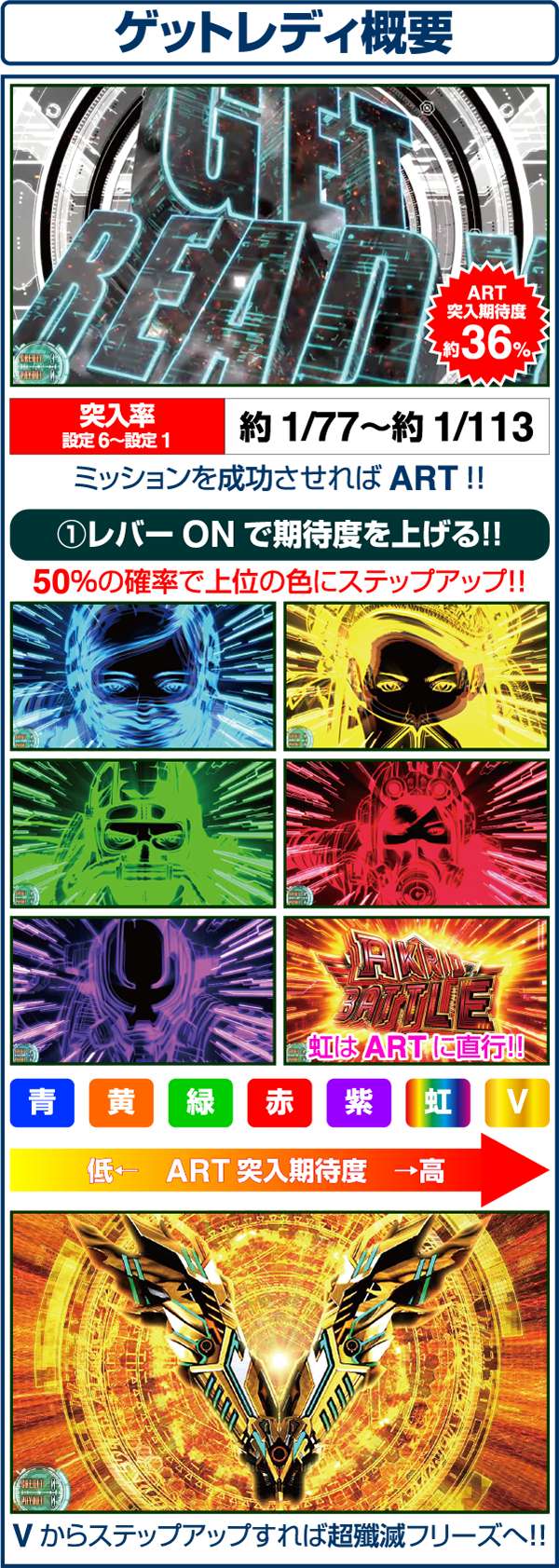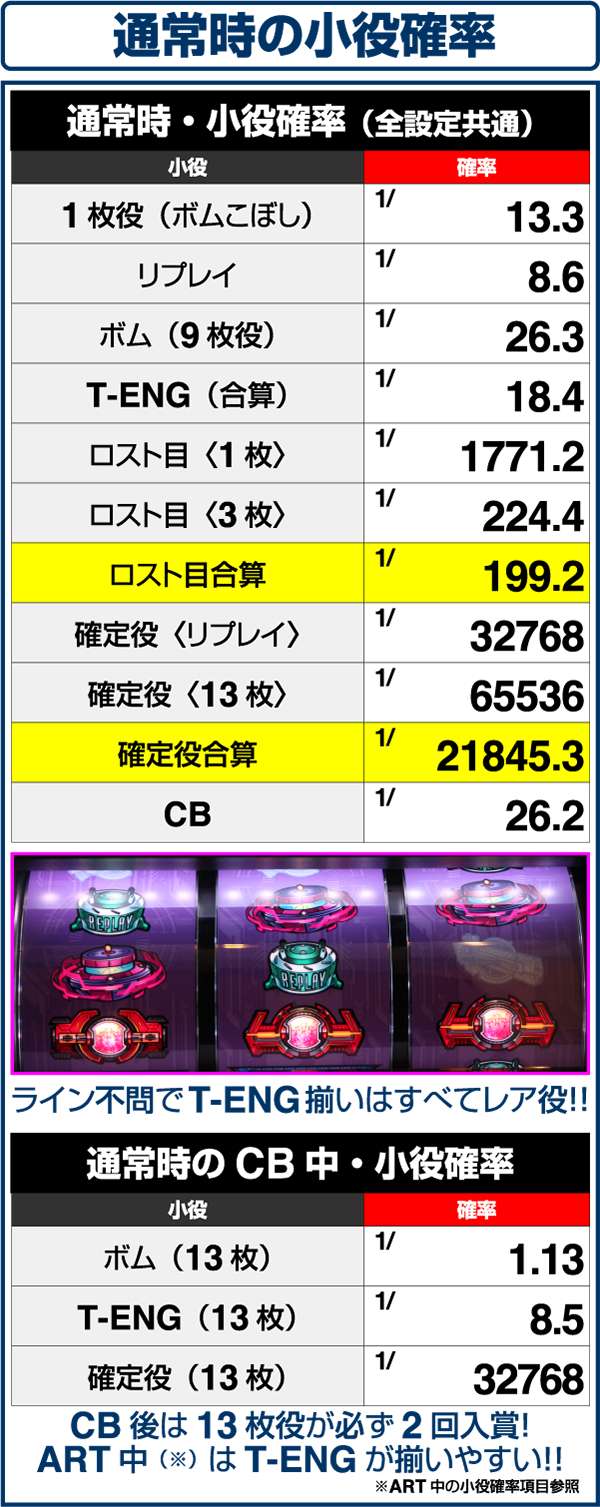 レア役の合算確率は約15分の1と高く、T-ENGを引いてモードをアップさせ、CZの「ゲットレディ」に突入させるという流れがART当選のメインルートとなる。