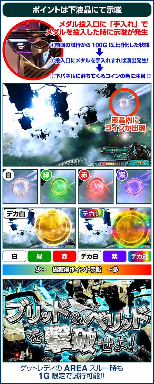 アクションシューティングゲーム「ロスト プラネット2」がパチスロとして登場する。 出玉増加の軸となるのは1Gあたりの純増2.0枚のART「エイクリッドバトル」。 勝利する限り継続するバトルタイプARTとなっているため、規定ゲーム数や差枚といった概念はなく、バトルが続くほどARTも長くなる。勝利時はバトルを優位に運べるT-ENGを複数獲得できるため、勝てば勝つほどロング継続に期待が持てる。 |