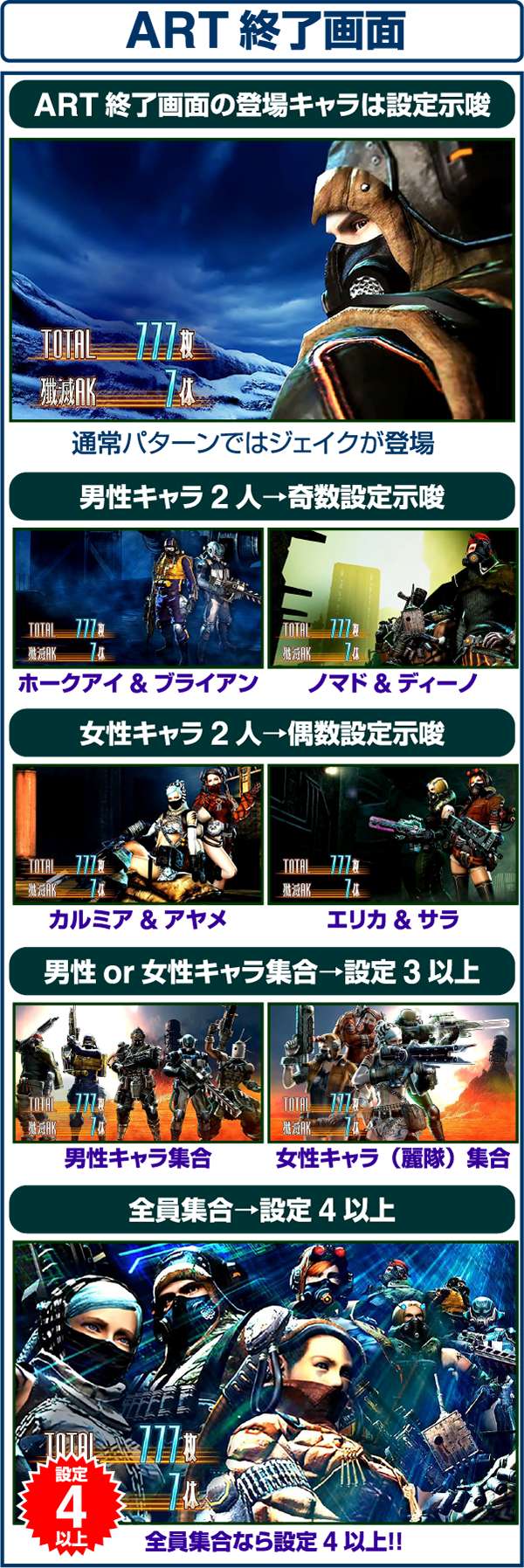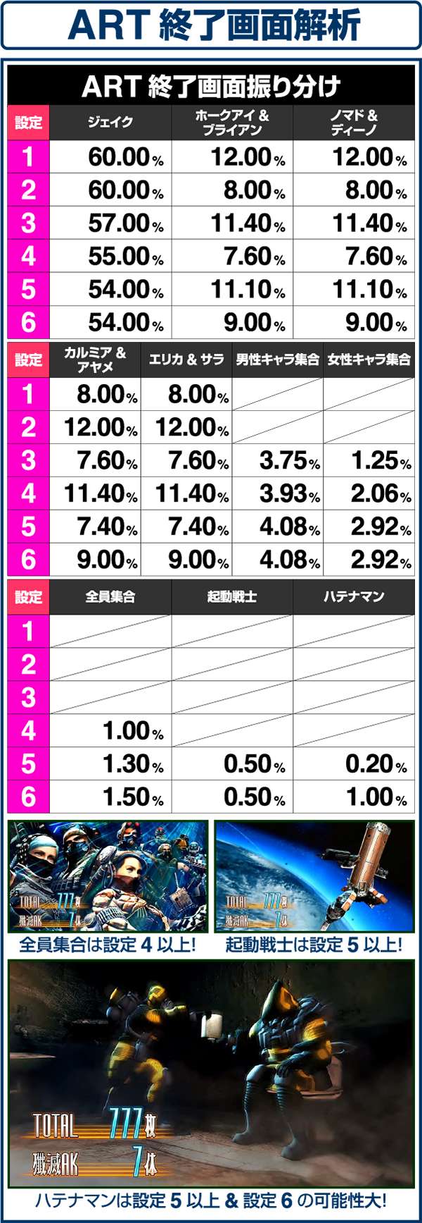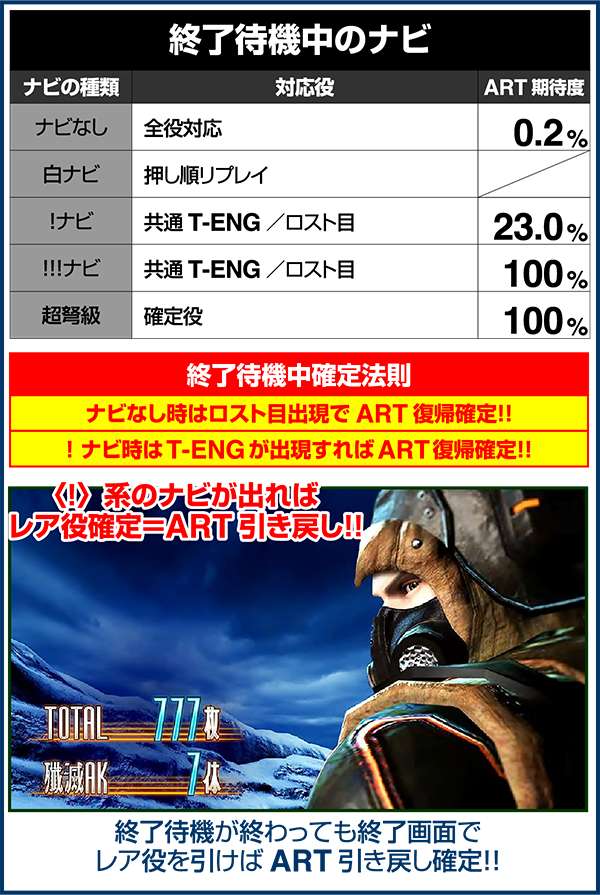 また、終了待機&終了画面でもART抽選がおこなわれており、終了画面ではレア役成立=引き戻し確定となる。