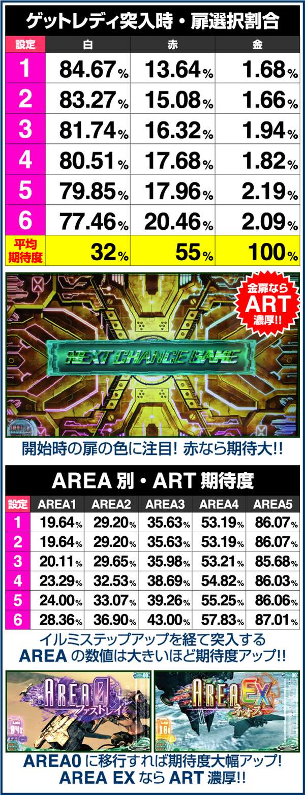 ゲットレディは主に突入時のレバーONでARTが抽選されるため、扉の色とイルミステップアップがそのままゲットレディの期待度となるわけだ。ただ、突入時の抽選に漏れた場合も各AREA滞在中の抽選でARTに突入するパターンがある。