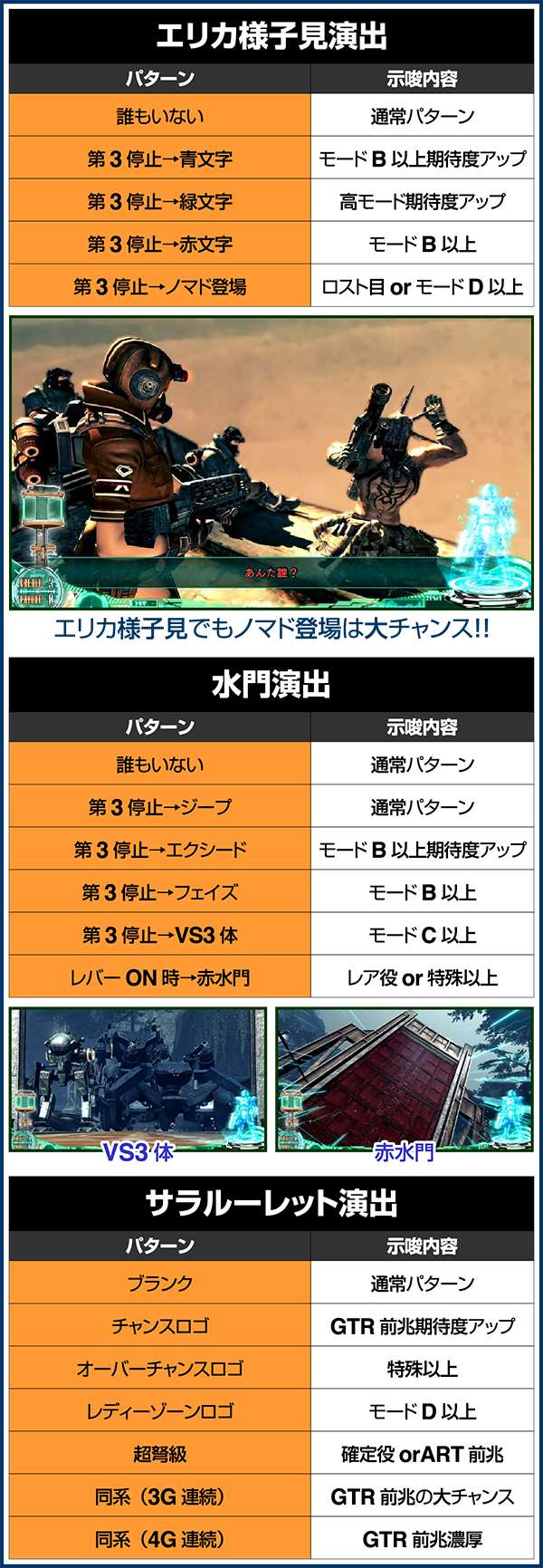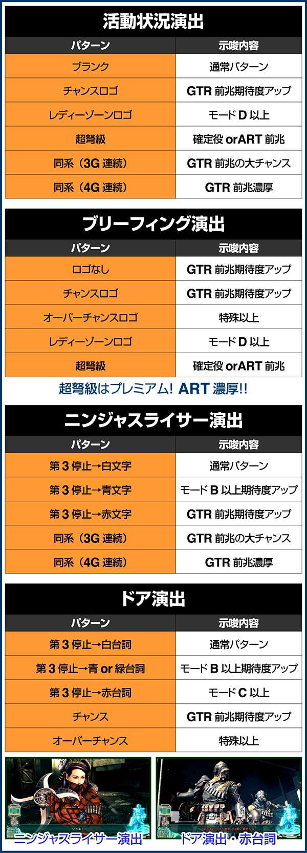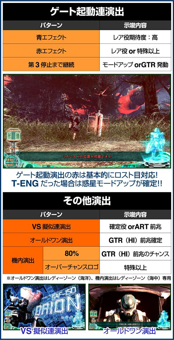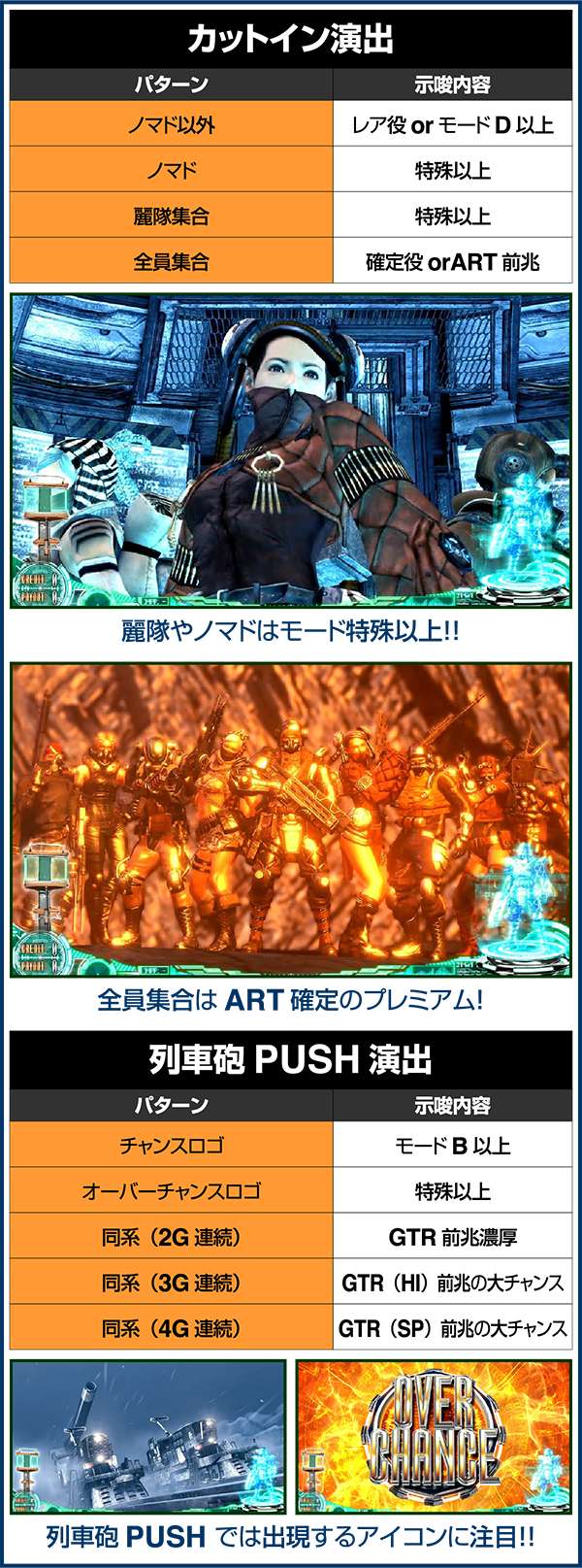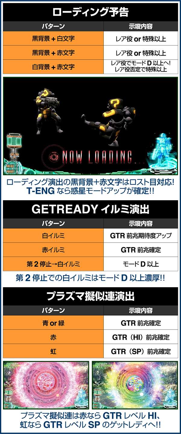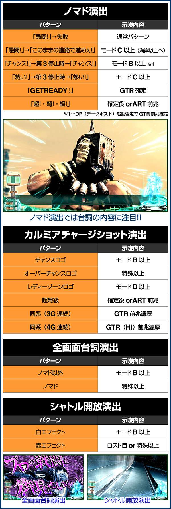 各演出では基本的に青文字出現でモードB以上期待度アップ、赤文字でモードB以上やGTR(ゲットレディ前兆)となる。同系演出の連続も重要となるため、3G以上連続した場合は即ヤメせずにしばらく様子をみたいところだ。