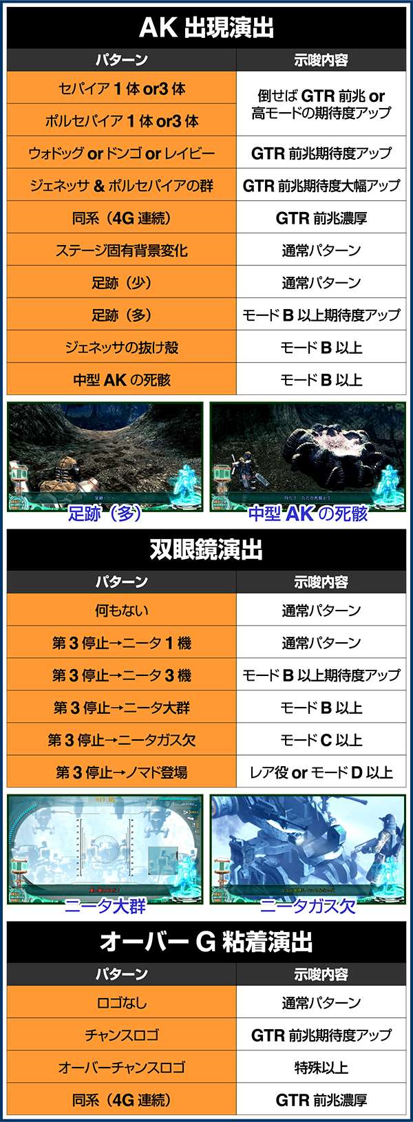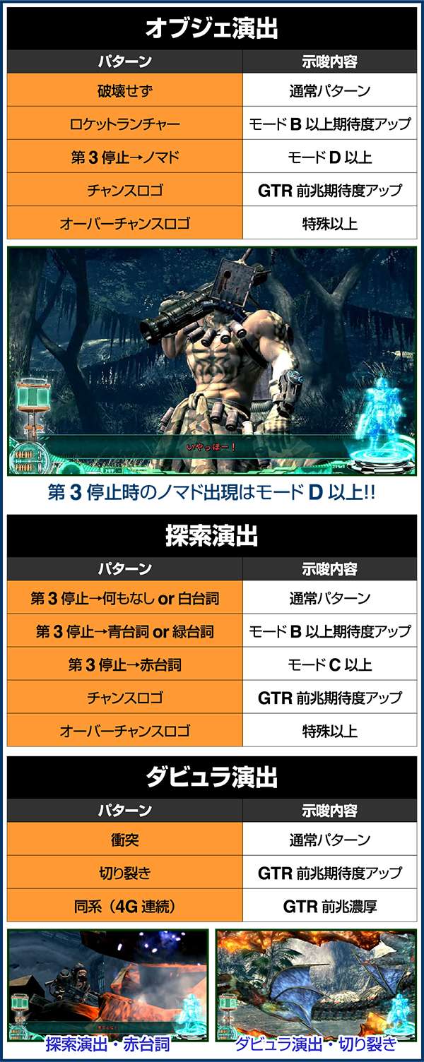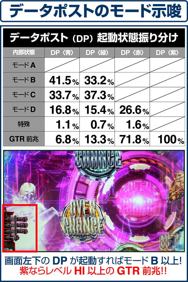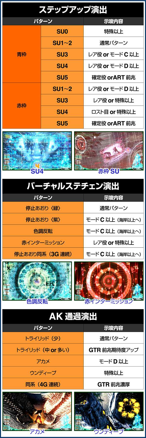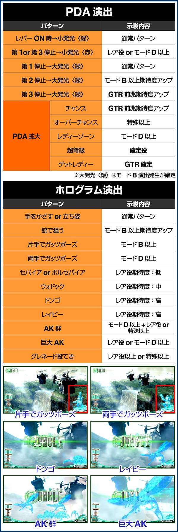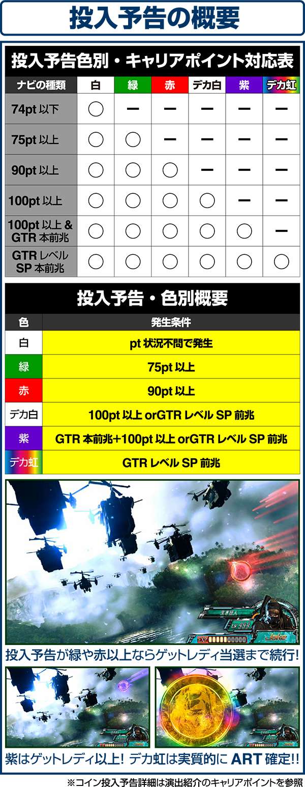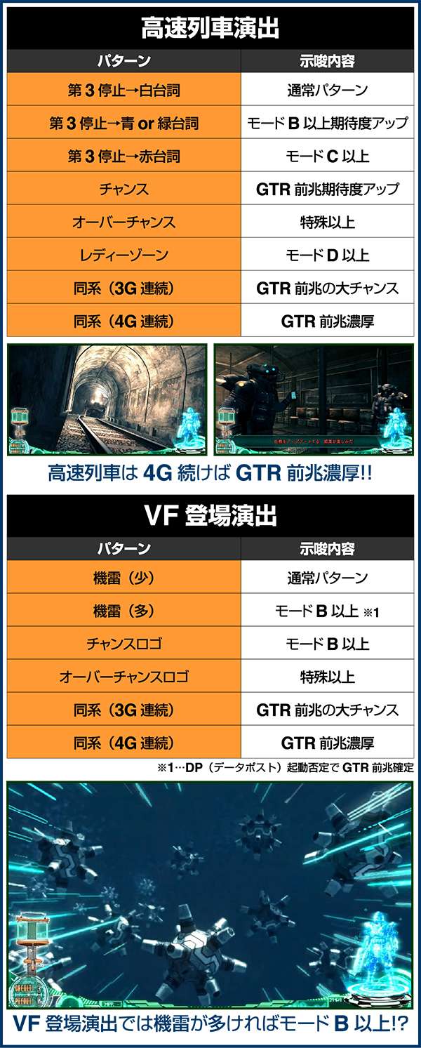 各演出では基本的に青文字出現でモードB以上期待度アップ、赤文字でモードB以上やGTR(ゲットレディ前兆)となる。同系演出の連続も重要となるため、3G以上連続した場合は即ヤメせずにしばらく様子をみたいところだ。