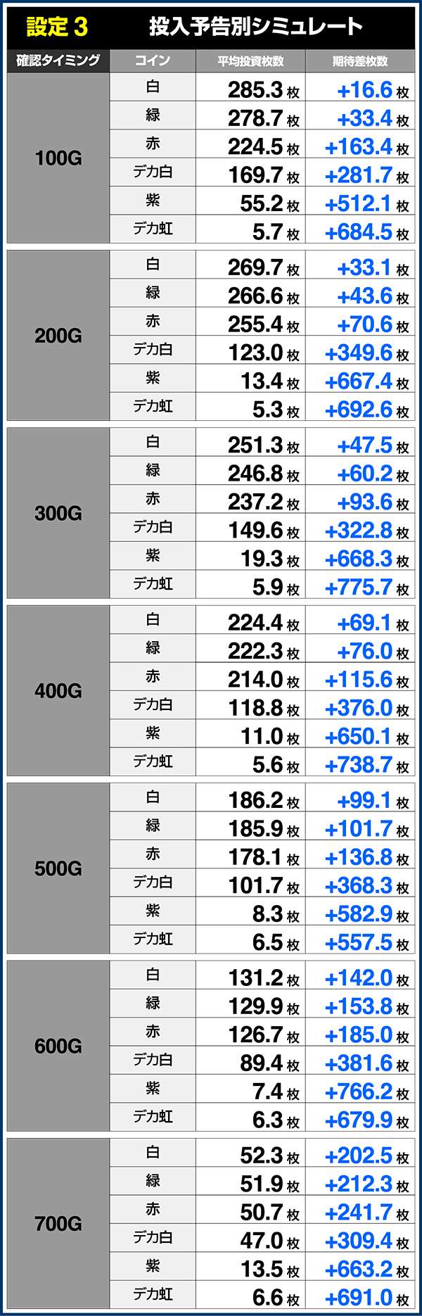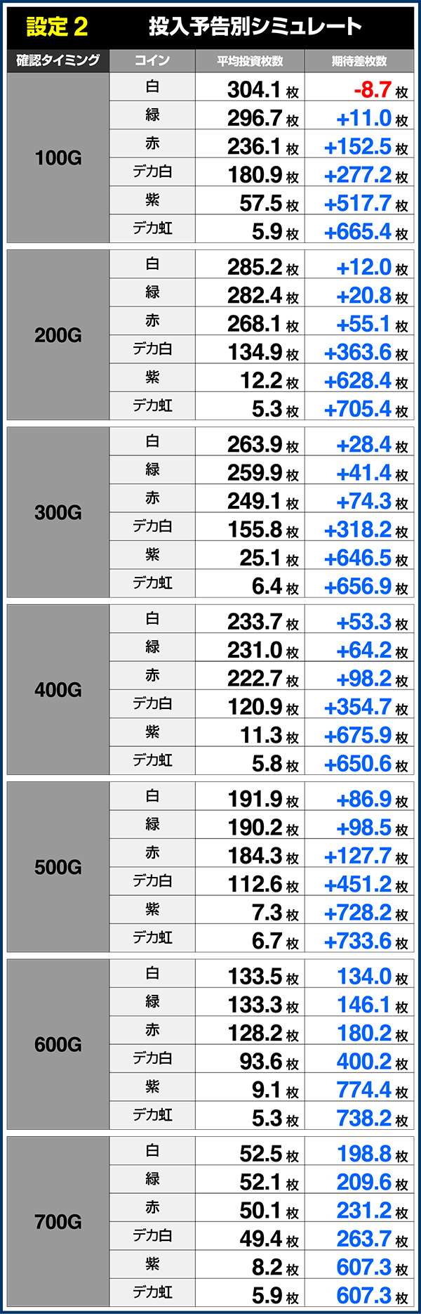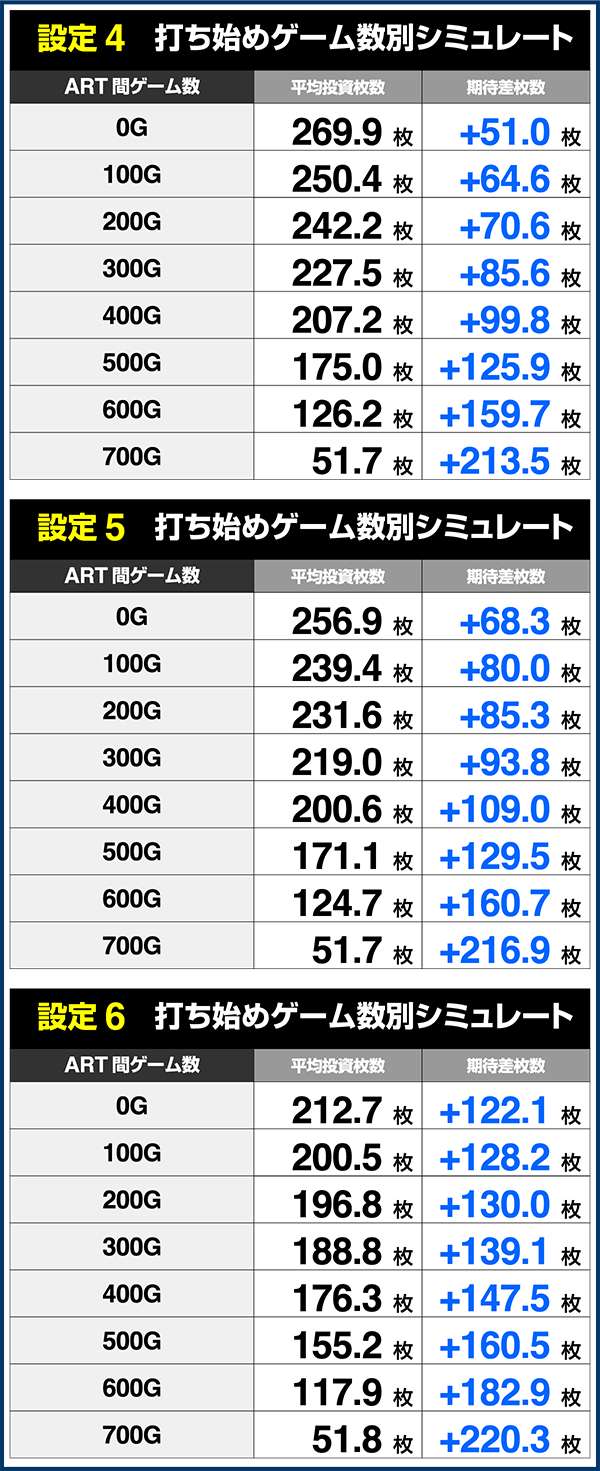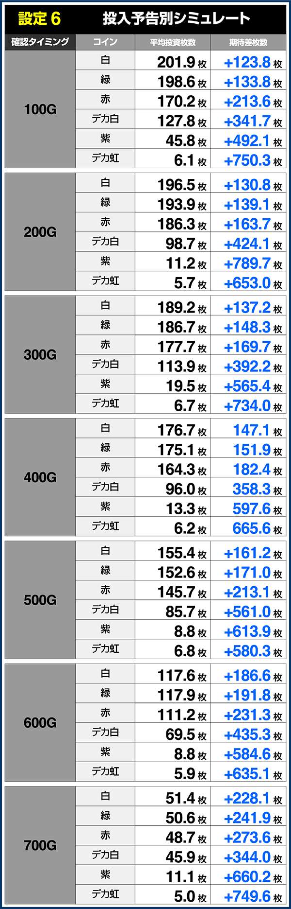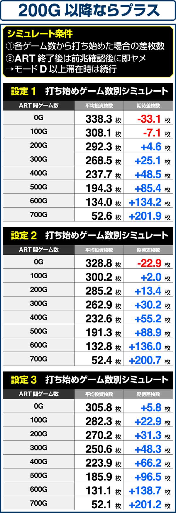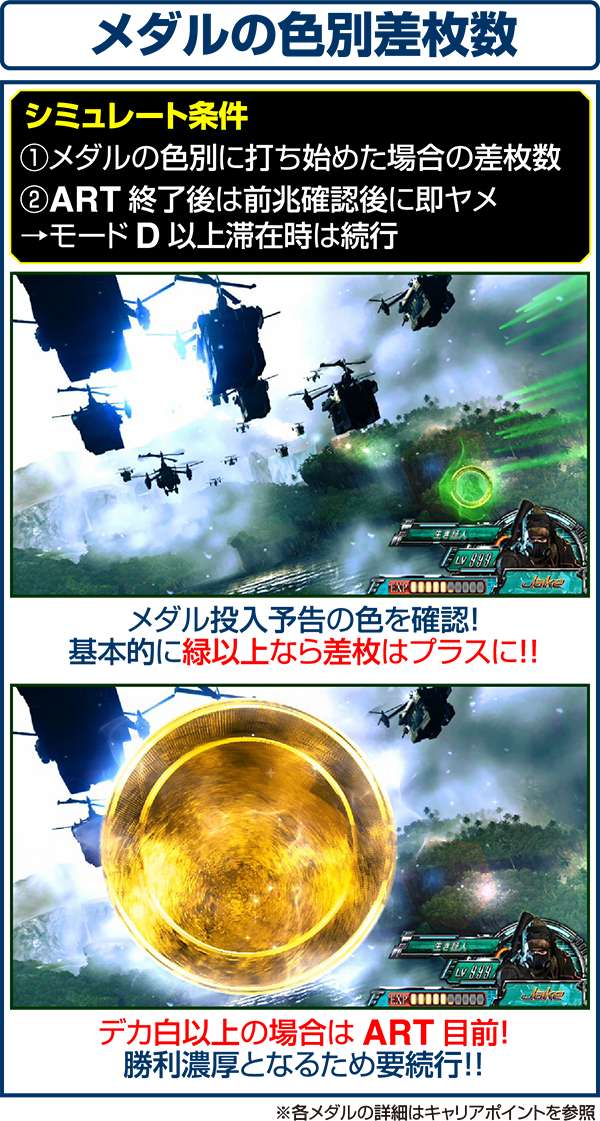 打ち始めのゲーム数は基本的にART間のゲーム数が大きいかつ投入予告で上位のメダルが出るほどプラス収支の期待値が高まる。 100G経過時に赤メダルが出現した時は要続行。 ART濃厚となるデカ白以上時は必ず当選まで打ち続けよう。
