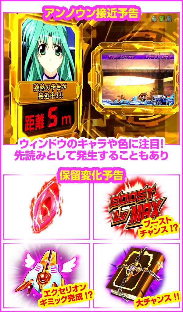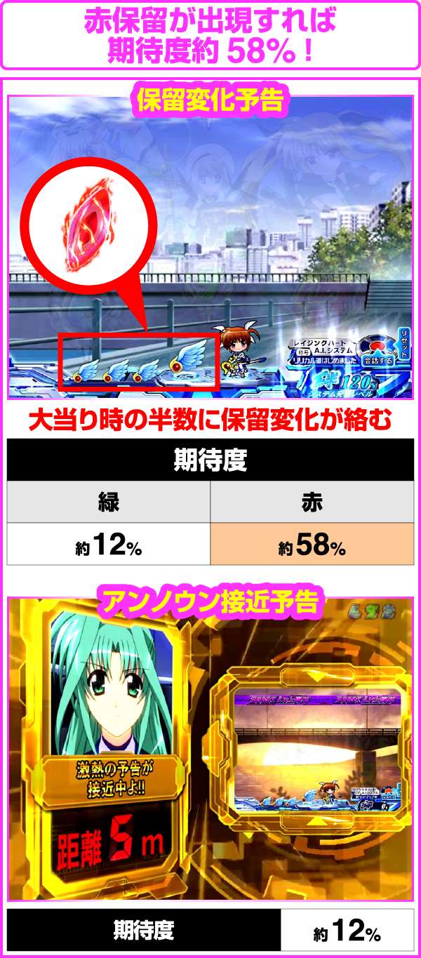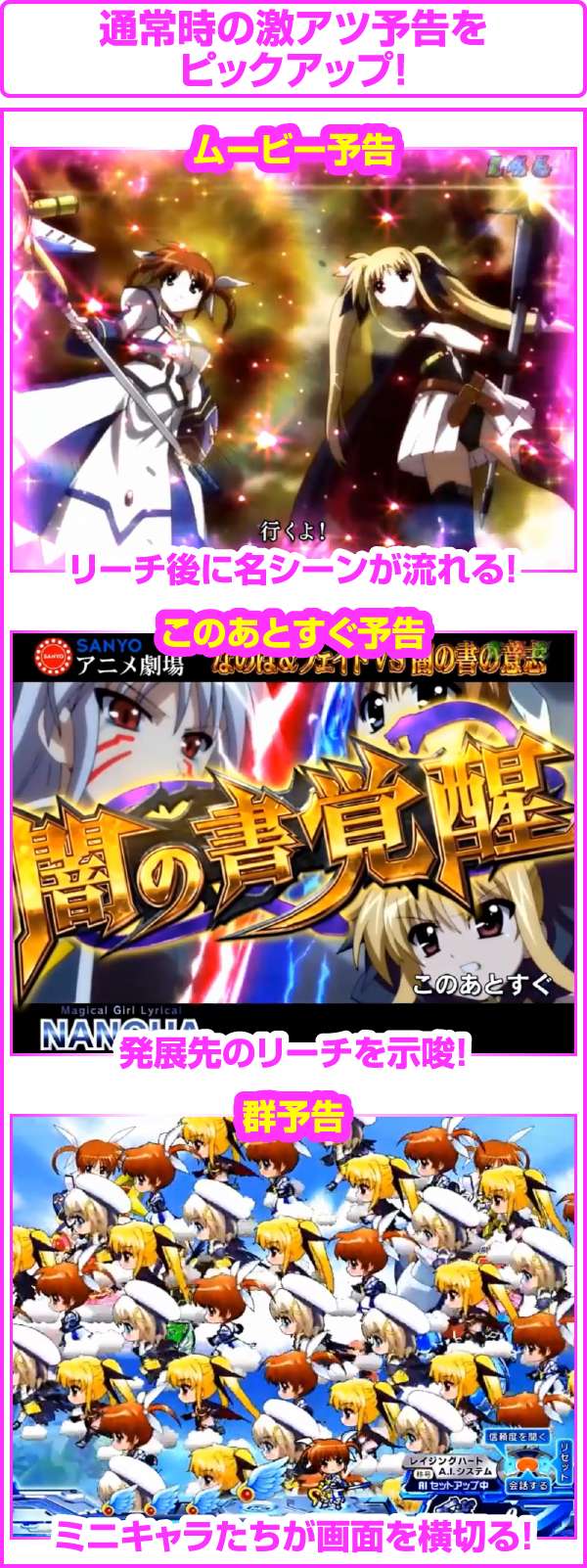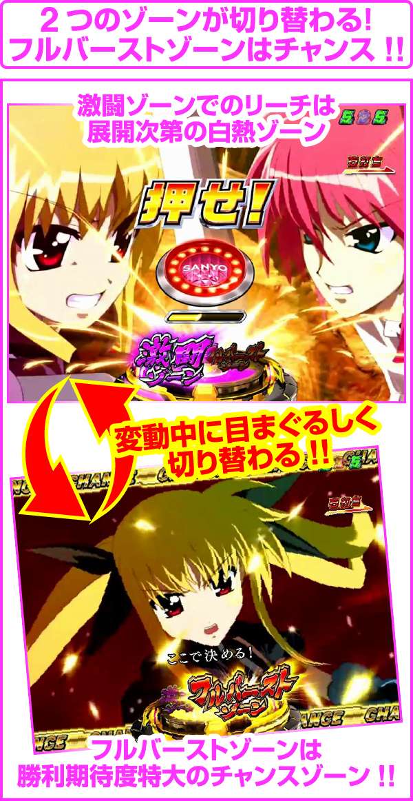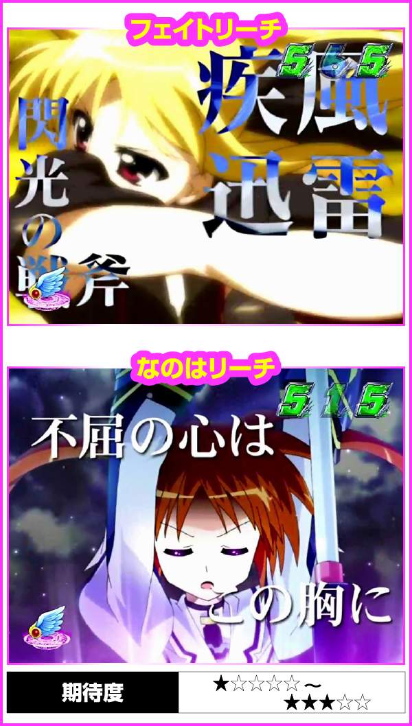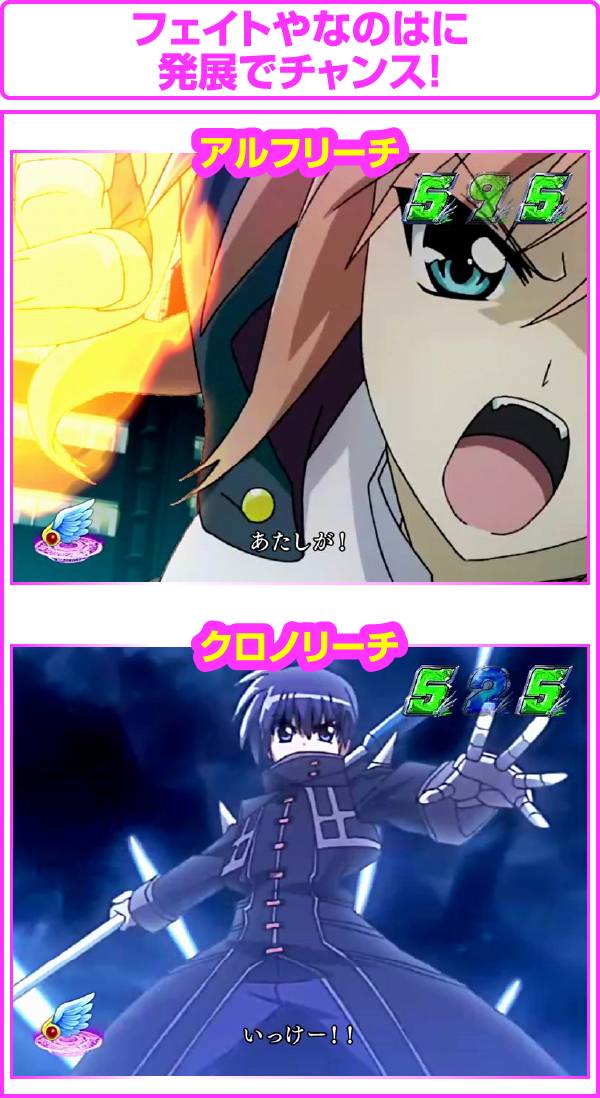 ちなみに、大当り濃厚の「はやて砲撃リーチ」は5R確変以上、「A’s全回転リーチ」はフルドライブボーナスが濃厚となるぞ!