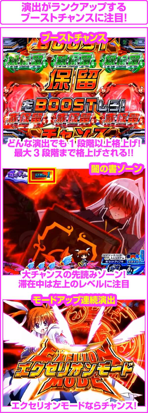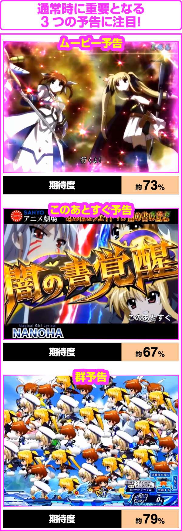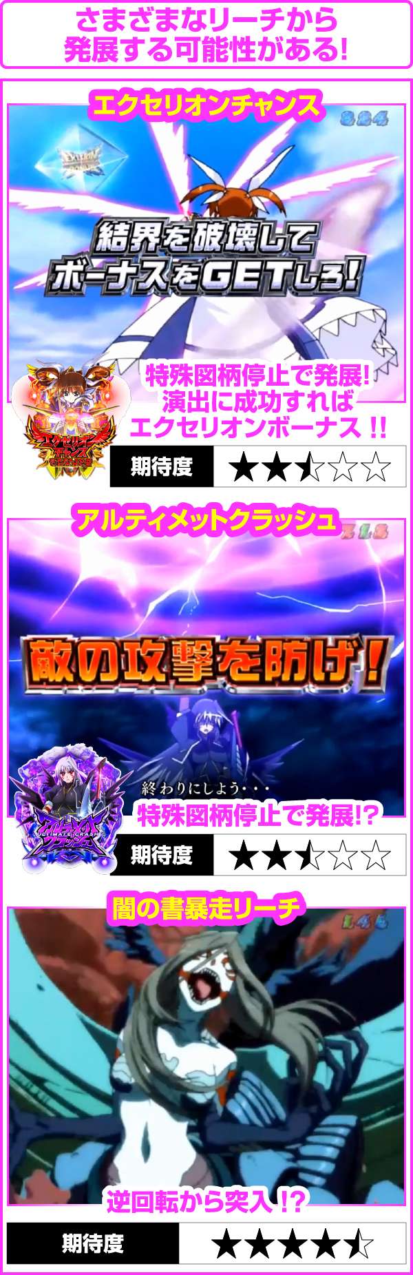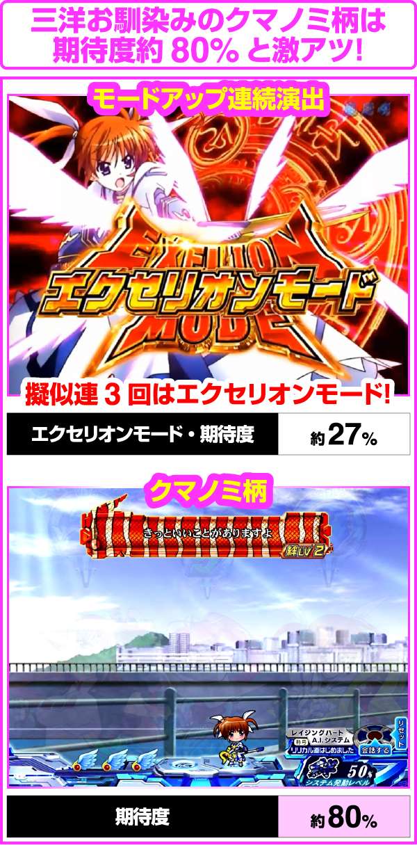ちなみに、大当り濃厚の「はやて砲撃リーチ」は5R確変以上、「A’s全回転リーチ」はフルドライブボーナスが濃厚となるぞ!