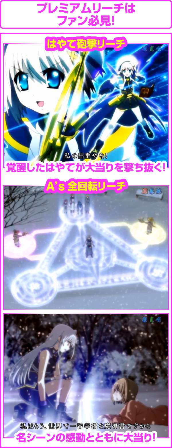 覚醒したはやてが活躍する「はやて砲撃リーチ」と感動の名シーンで展開する「A’s全回転リーチ」の2種類のプレミアムリーチはファン必見!