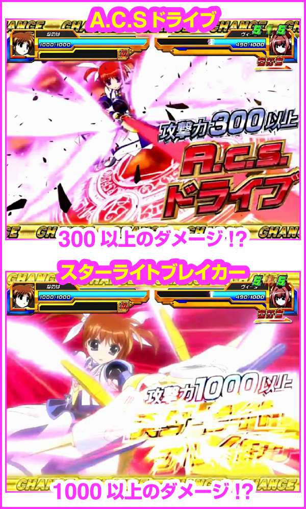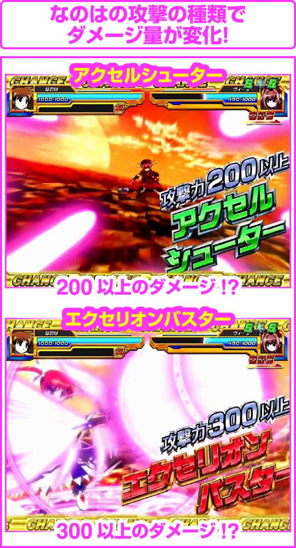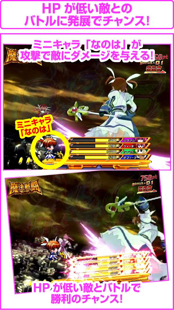 バトルは3回の攻防で敵のHPを0にできれば勝利。なのはが攻撃すれば勝利のチャンス、敵の攻撃は逆にピンチとなる。なのはが攻撃した時は技の種類に注目で、赤文字の攻撃ならアツく、スターライトブレイカーを放てば勝利は目前!?