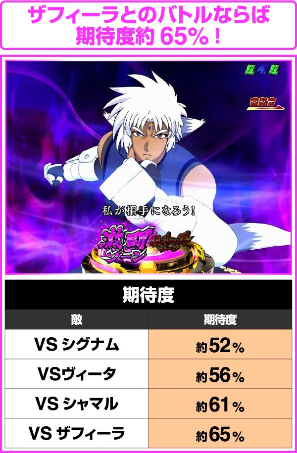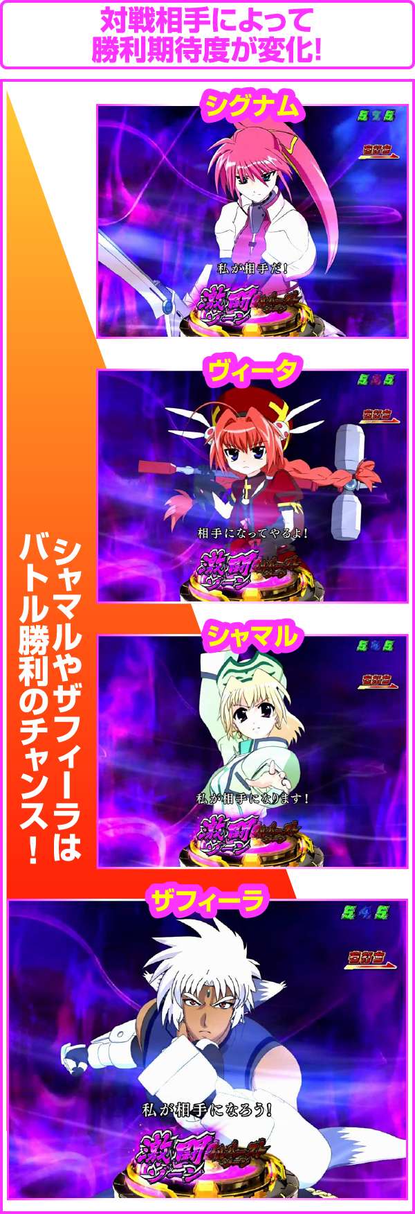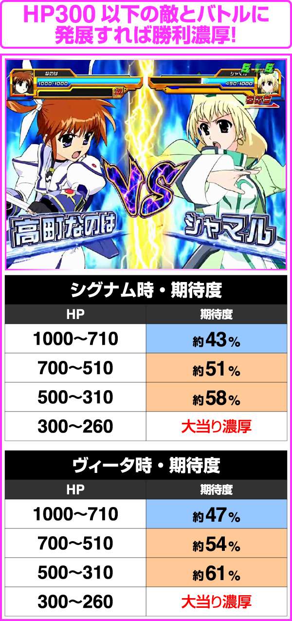 ザフィーラがもっともチャンスとなり、勝利期待度は約65%。VSシグナムでも、赤や金色の予告などが出現すれば、勝利のチャンス!