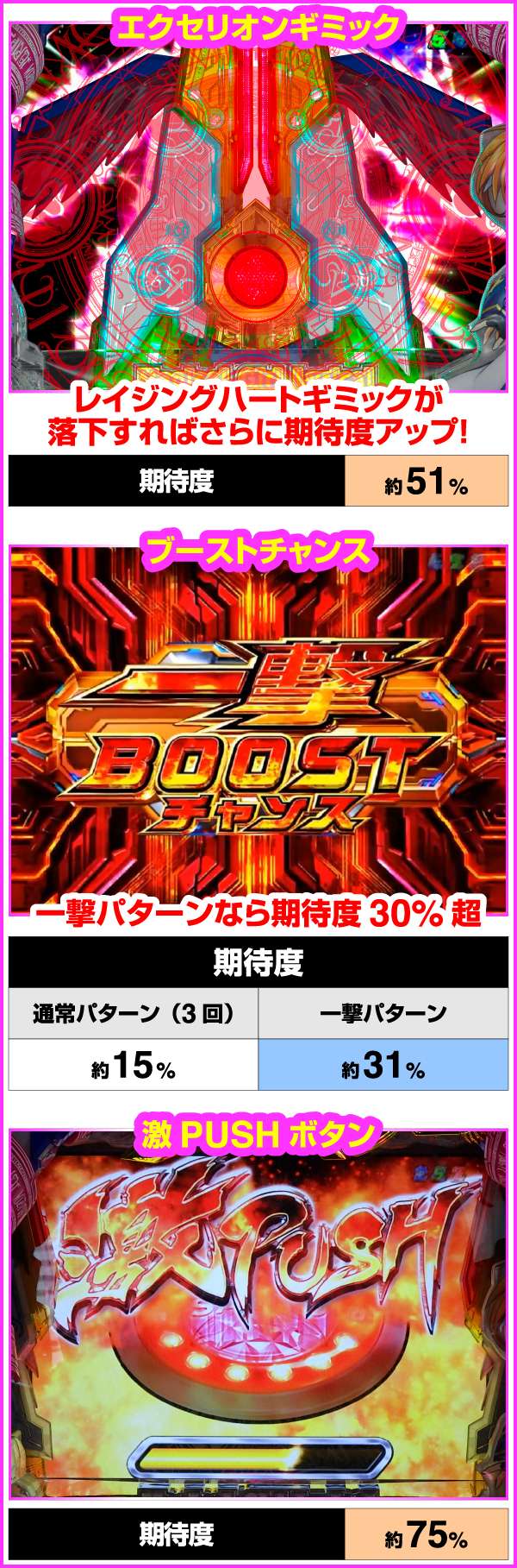 ブーストチャンスが発生すれば、演出がランクアップする。一撃パターンやワンモア発生で、期待度はさらにアップ。