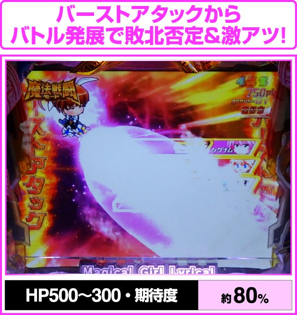 バトル発展前は液晶下に表示されている敵のHPバーに注目しよう。変動中に攻防が繰り広げられ、ミニキャラ「なのは」がHPバーを攻撃。HPが減っているキャラとバトルになれば、勝利期待度がアップ!