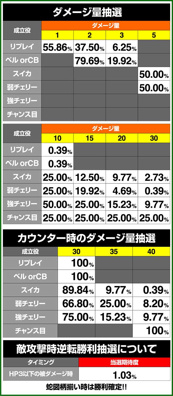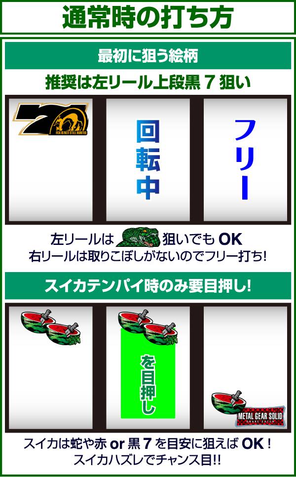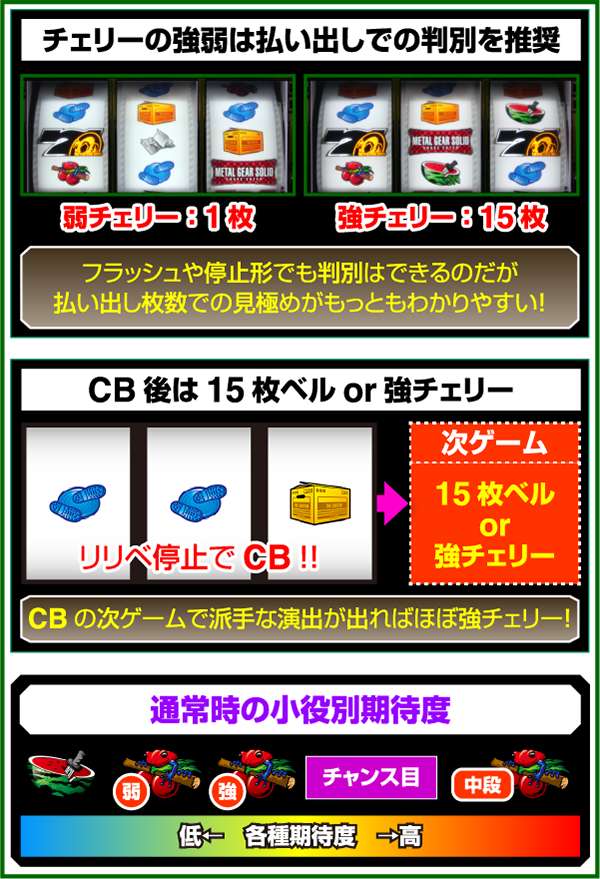 基本的にスイカ以外取りこぼしはないため、チェリー成立時に左リールにチェリーを狙わなかった場合でも払い出しは得ることができる。そのため、左リールは蛇絵柄狙いでも問題なし。 また、弱・強チェリーの停止形は複数あるため、払い出し枚数での判別を推奨。1枚なら弱チェリー、15枚なら強チェリーとなる。