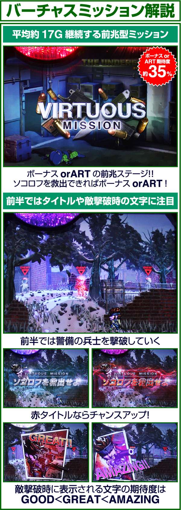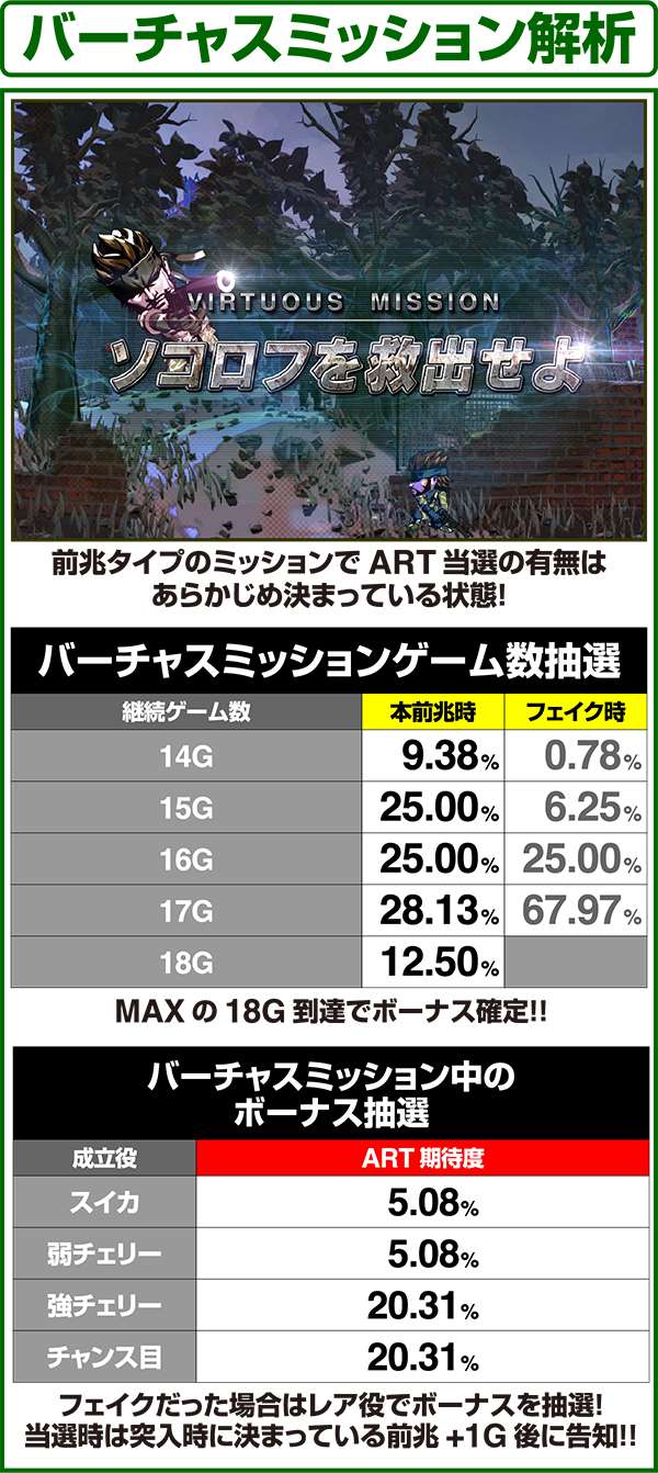 バーチャスミッションは突入時にボーナスorARTの当選があらかじめ決まっている前兆ステージとなっている。