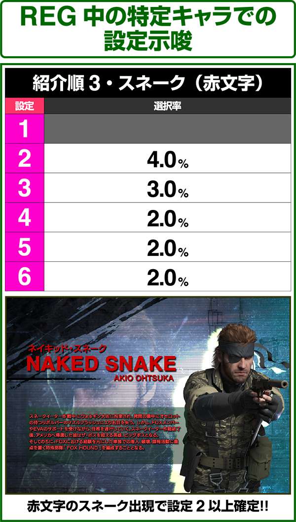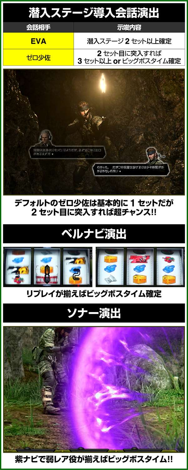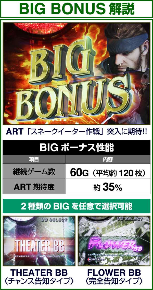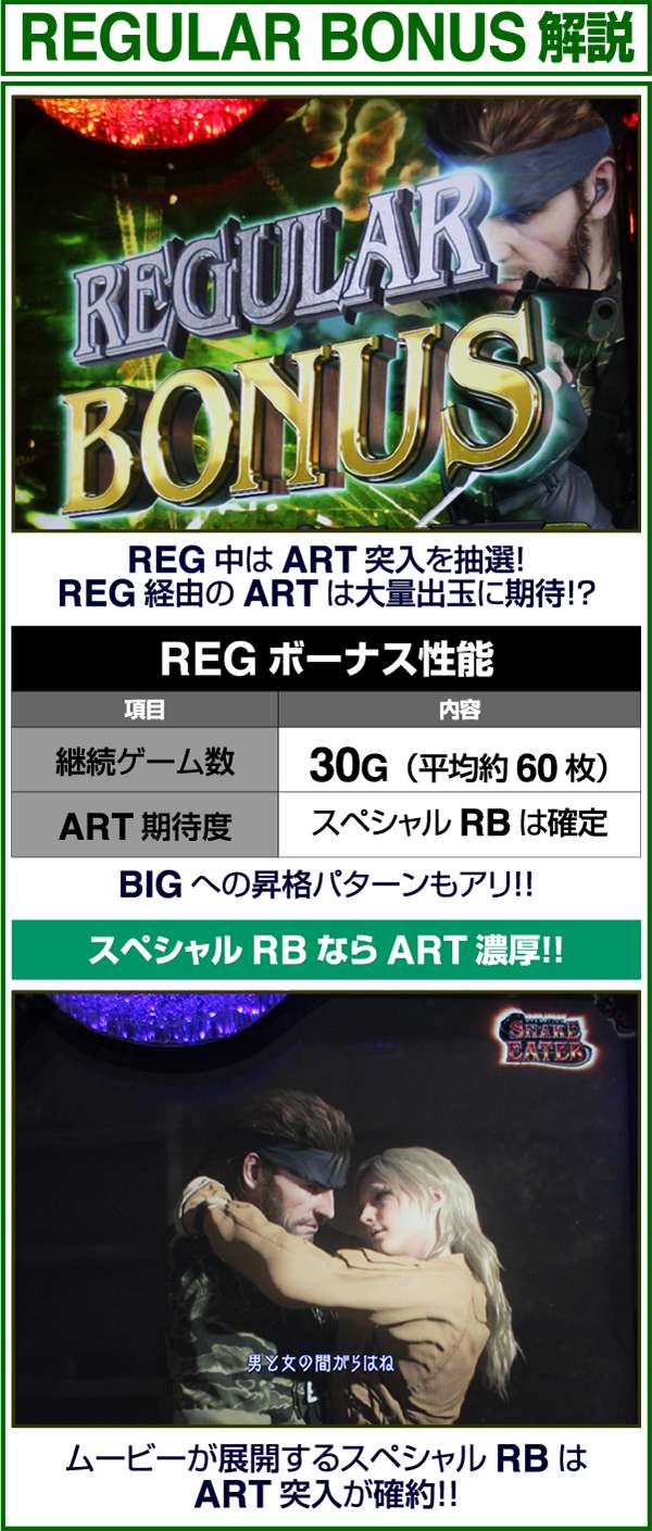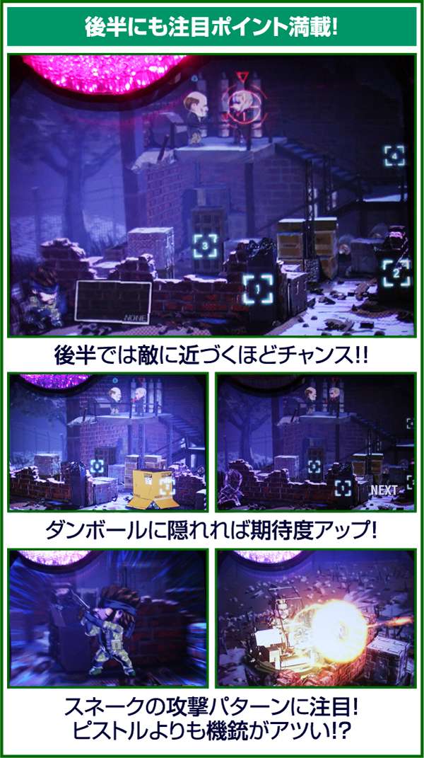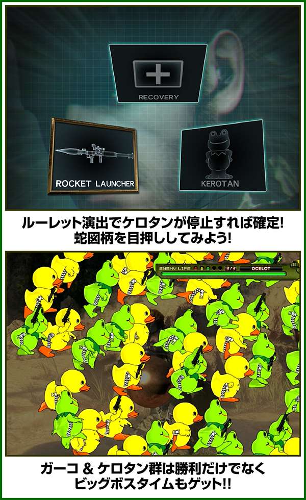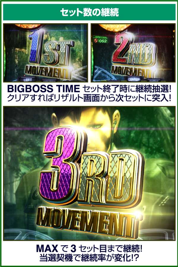 新筺体「BIGBOSS」とともに超大型ゲームタイトル「メタルギア」がパチスロとして登場。 出玉増加の軸となるのは1Gあたりの純増約2.0枚のART「スネークイーター作戦」で、通常時のゲーム性はレア役でCZであるミッションや疑似ボーナスを引き当て、ARTに繋げるという流れとなる。 ARTは自力継続バトル&セット数の混合タイプ。突入時の平均獲得枚数は約700枚と多く、一撃性を秘めたスペックといえる。 |