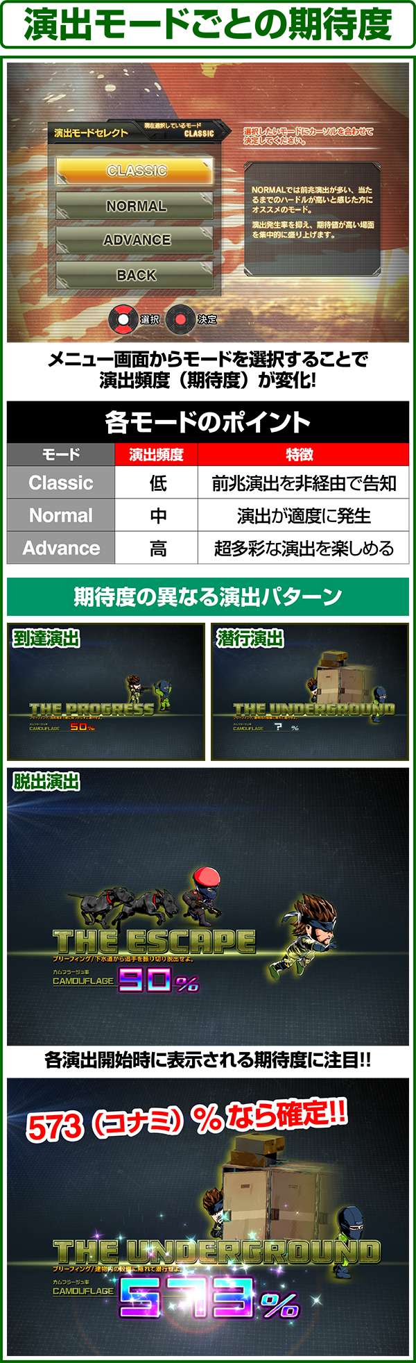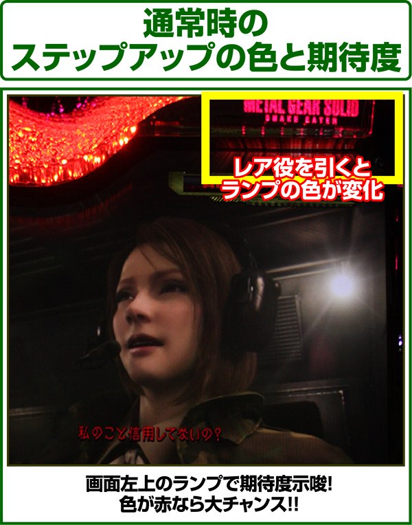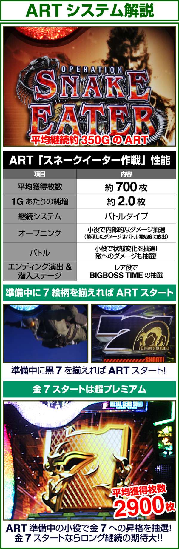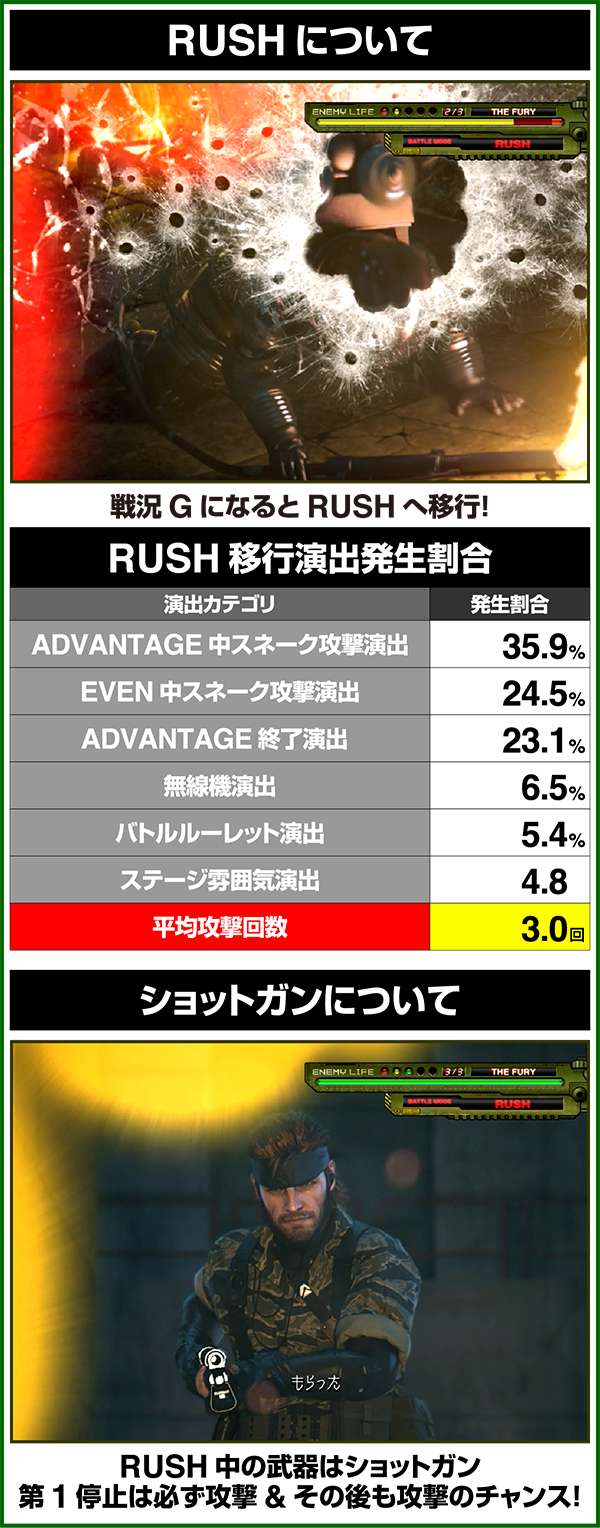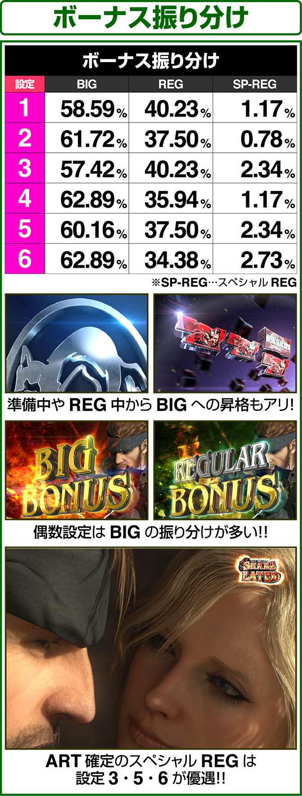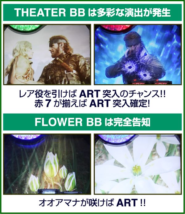 新筺体「BIGBOSS」とともに超大型ゲームタイトル「メタルギア」がパチスロとして登場。 出玉増加の軸となるのは1Gあたりの純増約2.0枚のART「スネークイーター作戦」で、通常時のゲーム性はレア役でCZであるミッションや疑似ボーナスを引き当て、ARTに繋げるという流れとなる。 ARTは自力継続バトル&セット数の混合タイプ。突入時の平均獲得枚数は約700枚と多く、一撃性を秘めたスペックといえる。 |