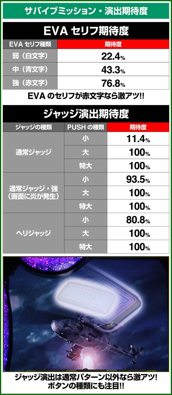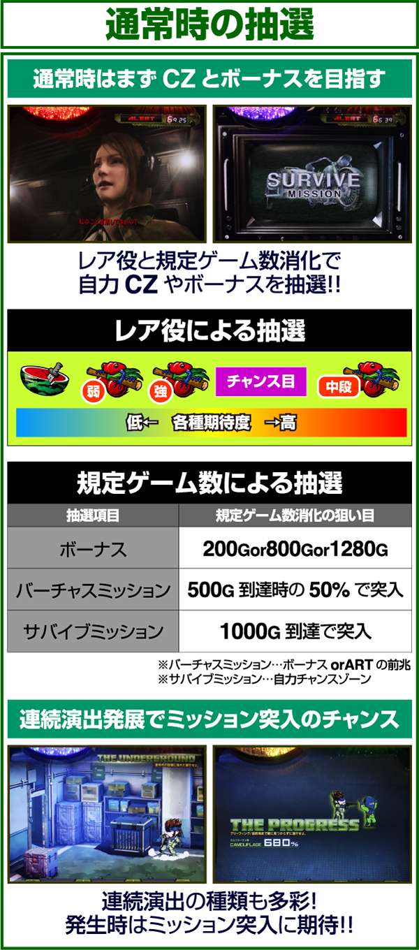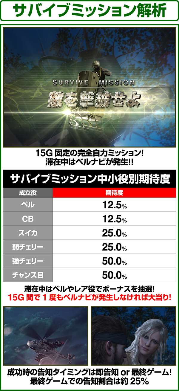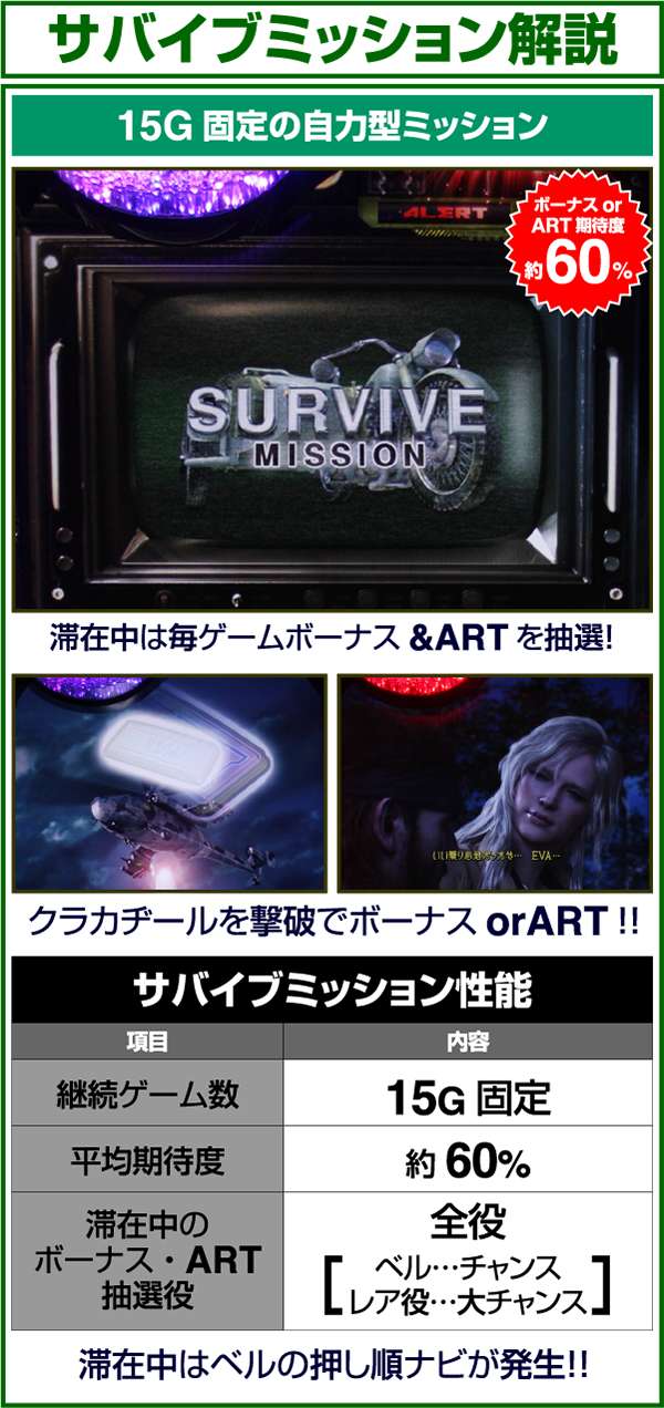 サバイブミッションは全役でボーナスorARTを抽選する自力CZとなっており、平均期待度は約60%。