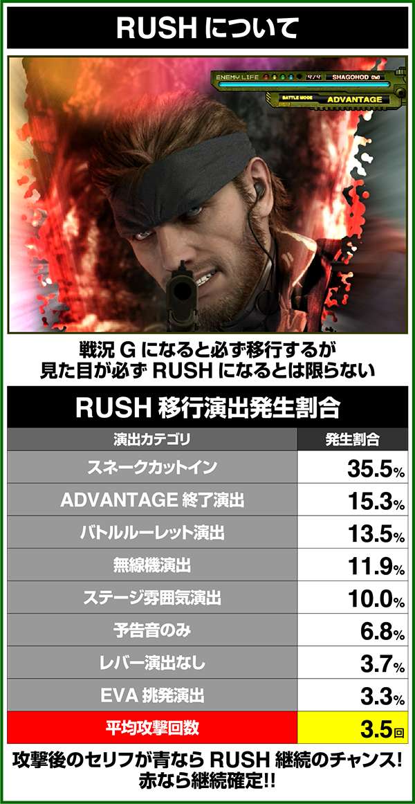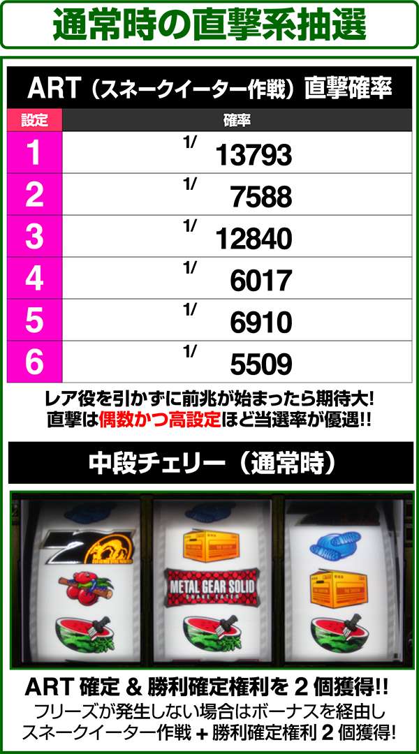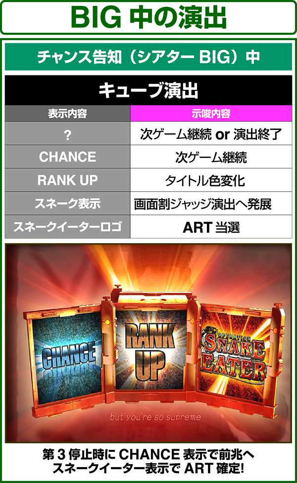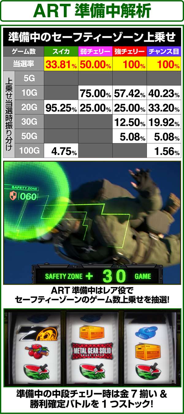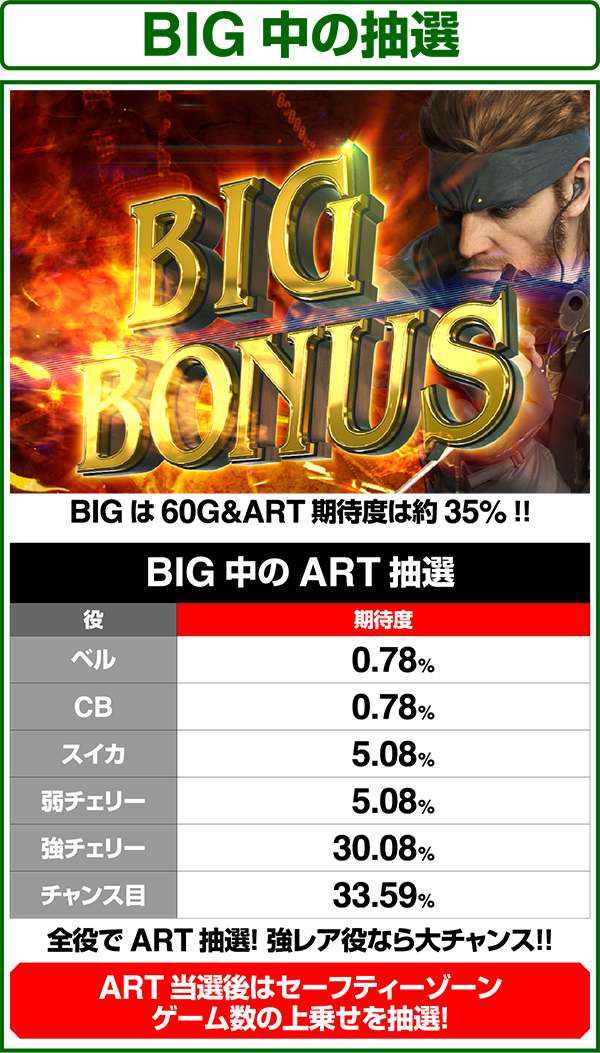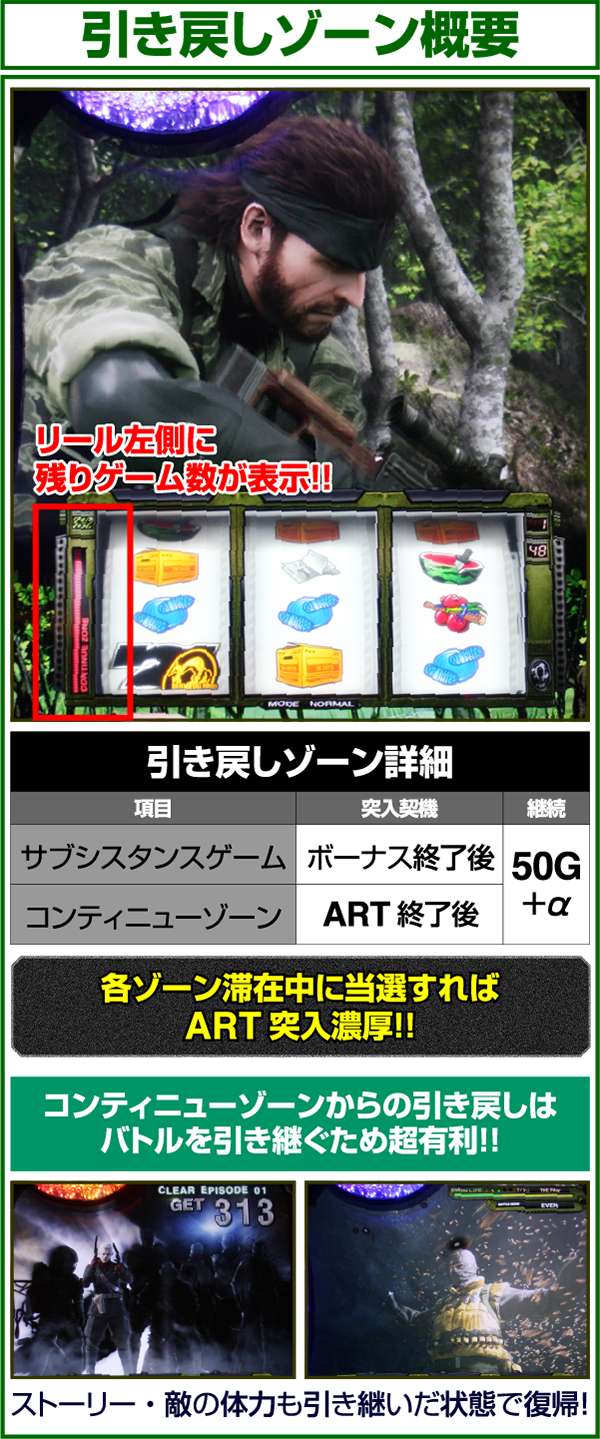 各引き戻しゾーンで当選した場合は必ずART「スネークイーター作戦」に突入(ボーナスにはならない)。