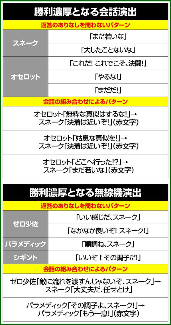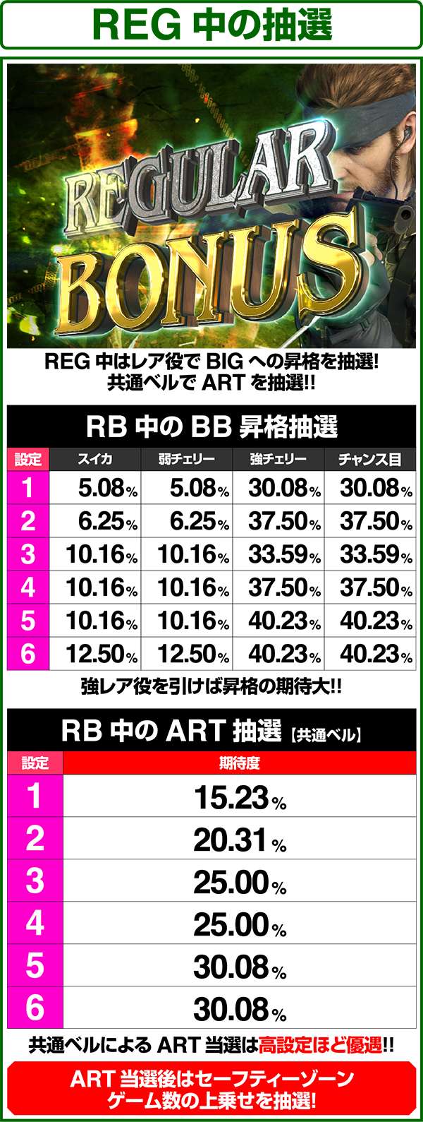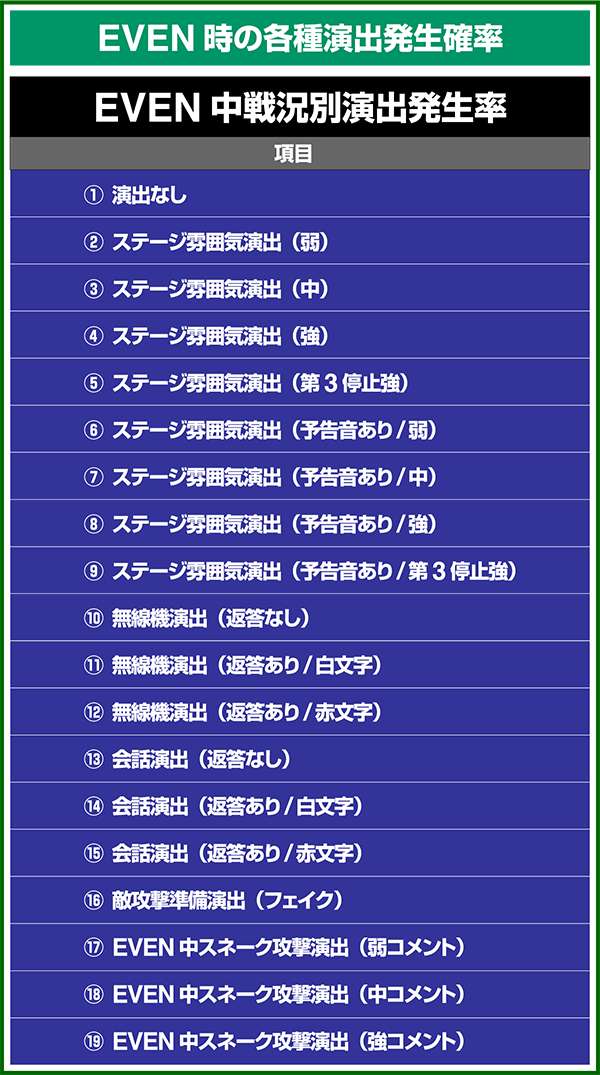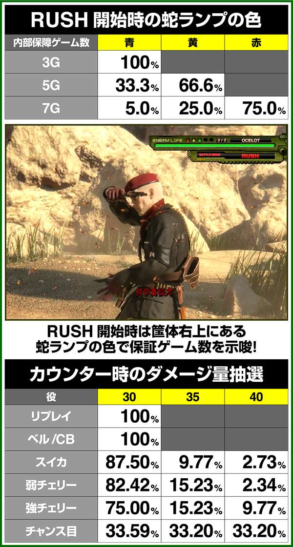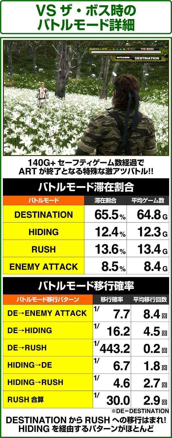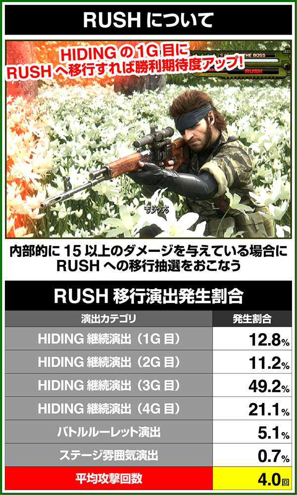 各引き戻しゾーンで当選した場合は必ずART「スネークイーター作戦」に突入(ボーナスにはならない)。