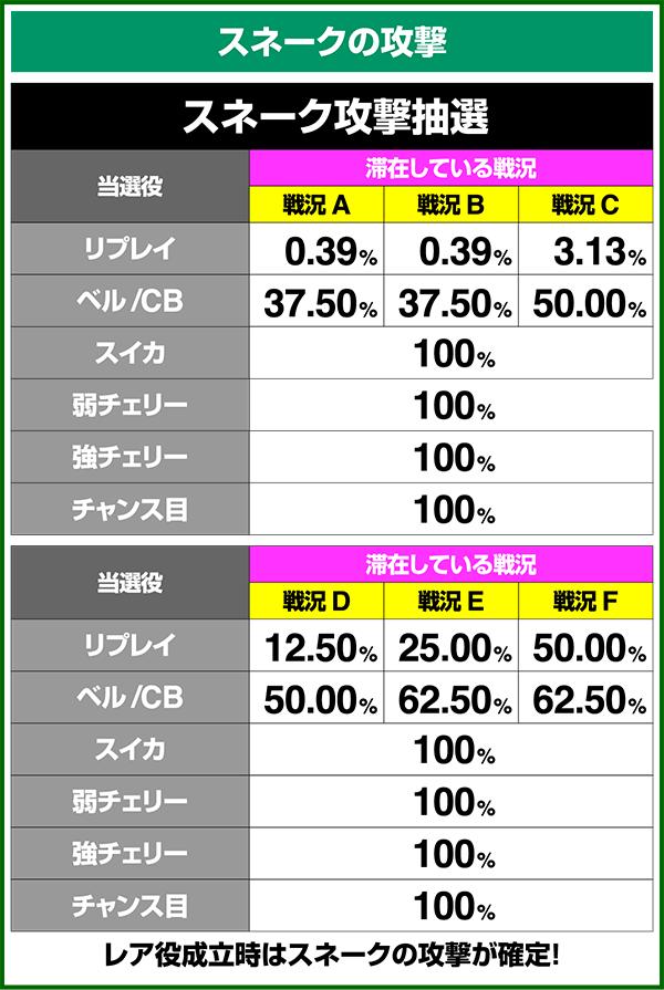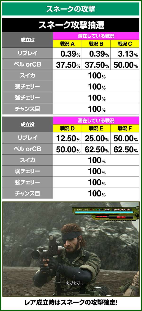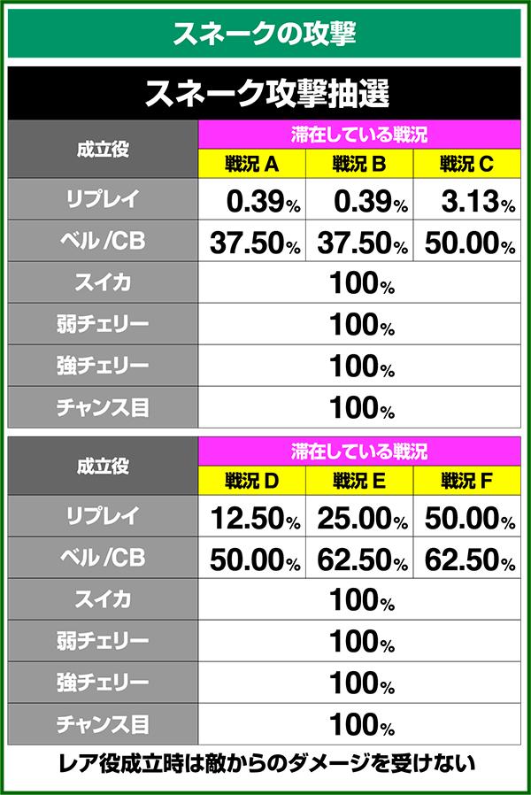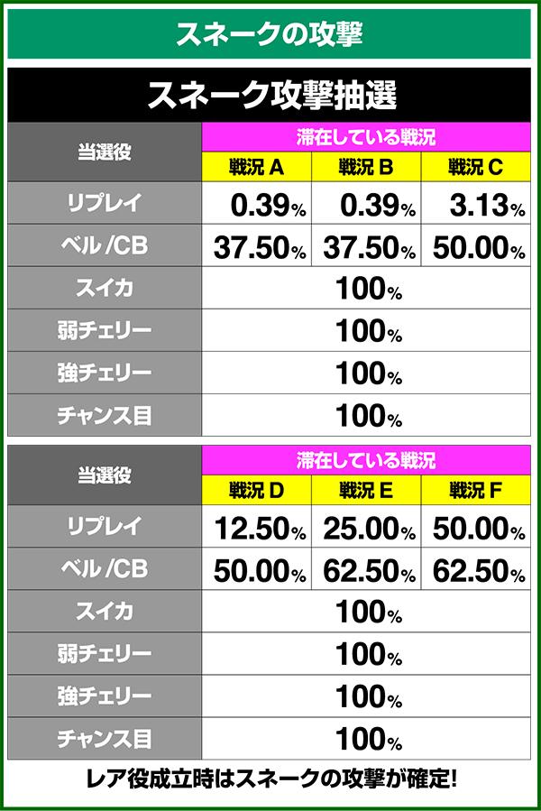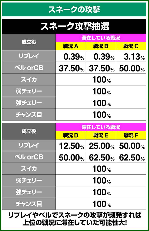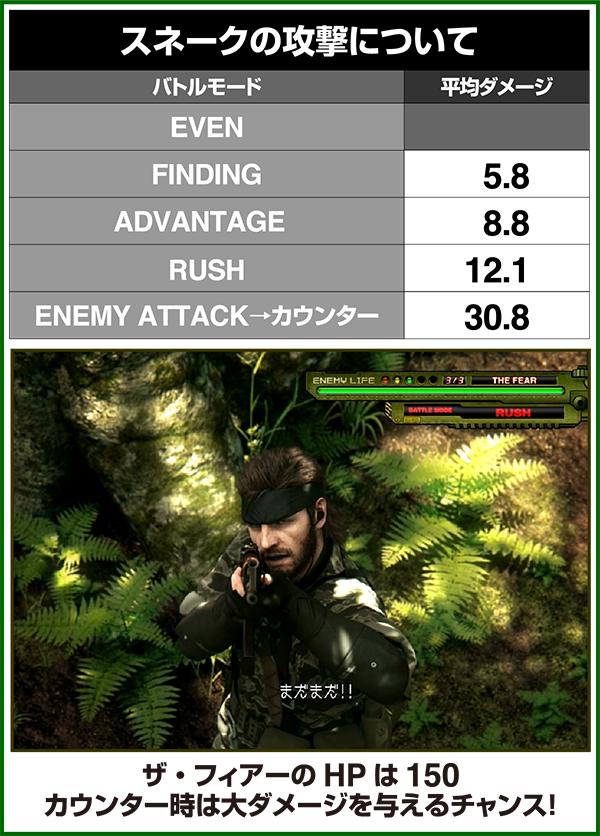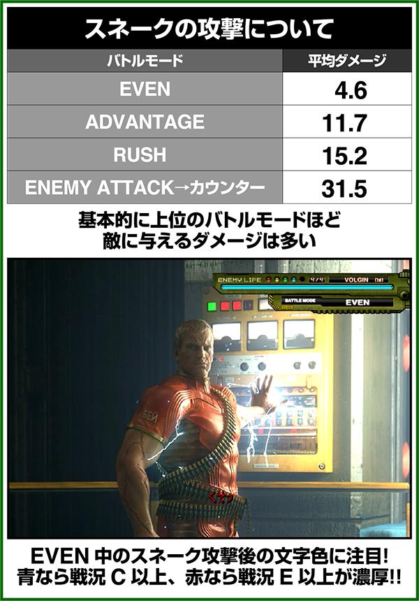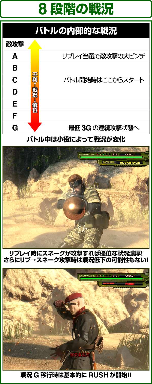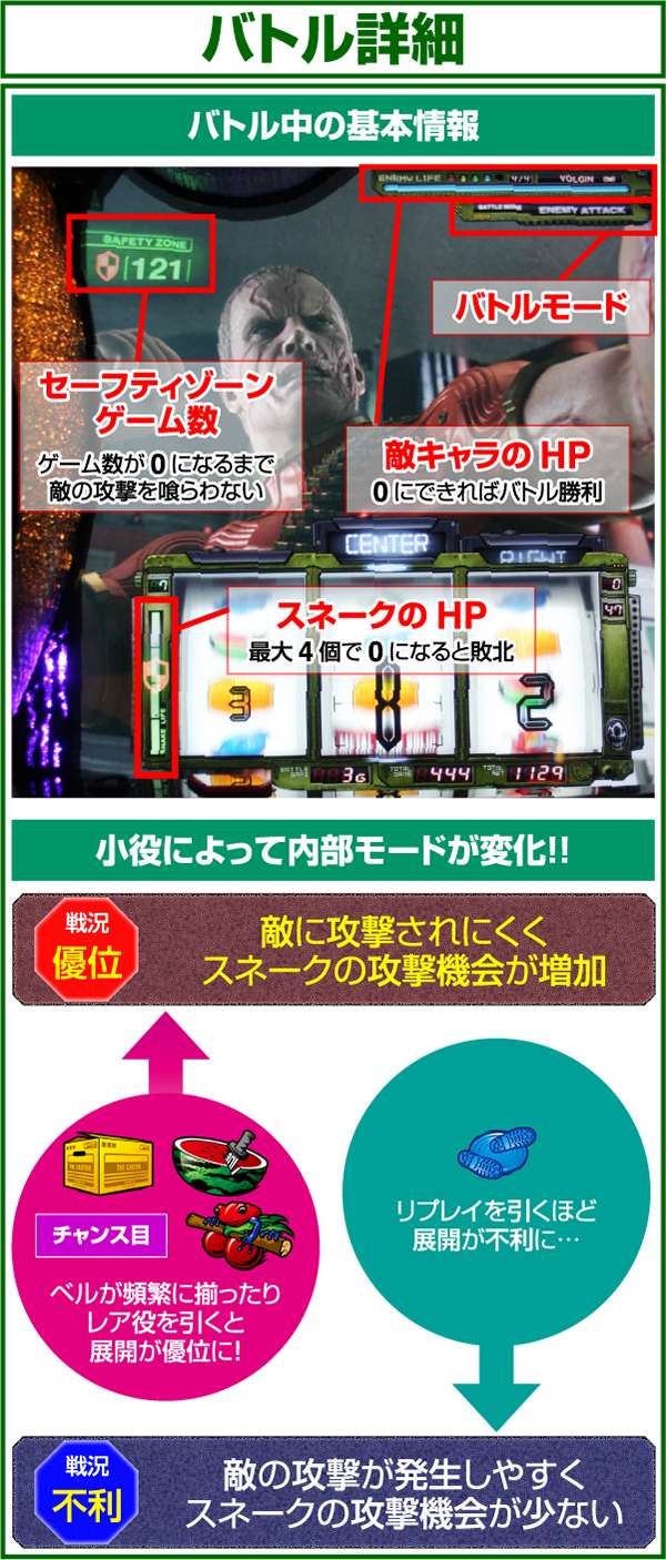 バトルには内部的な「有利」・「不利」という状態があり、まず対戦相手に依存した状況からスタート。以降はベルやレア役を引けば優位な状態に近づき、逆にリプレイが頻発すると不利な状態へ移行しやすくなる。成立役によって綱引きをしているイメージで、有利な状況であればスネークの攻撃機会が増え、リプレイでも敵にダメージを与えることがある。