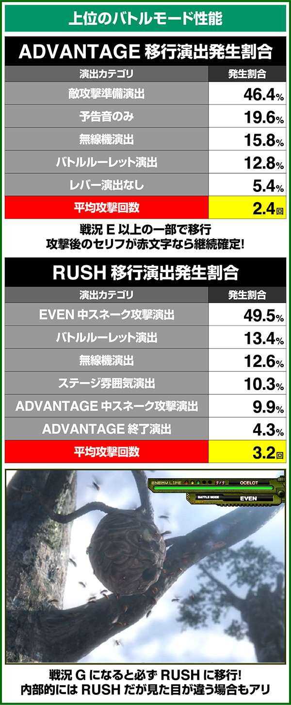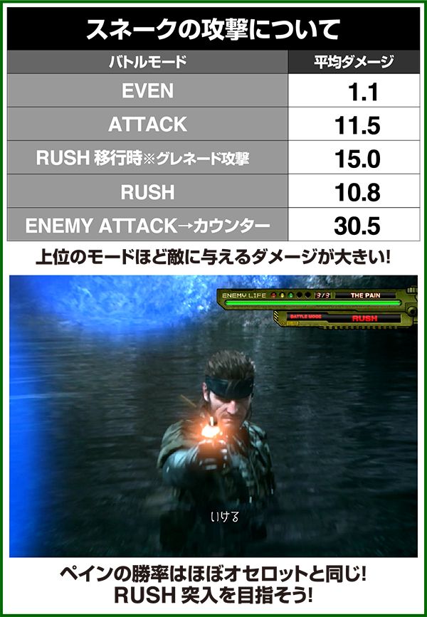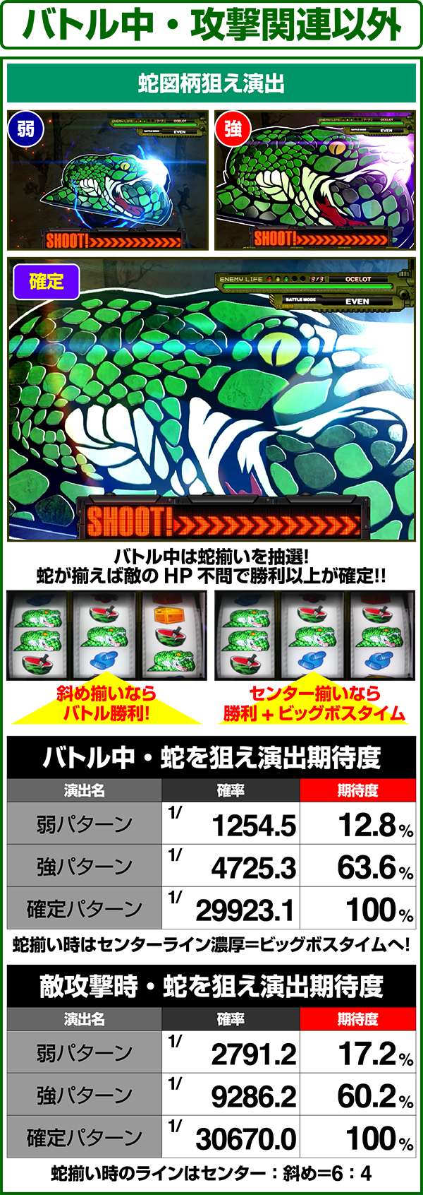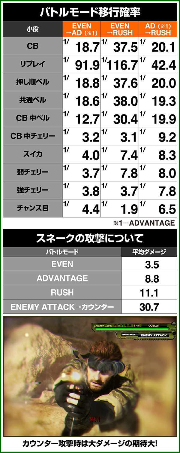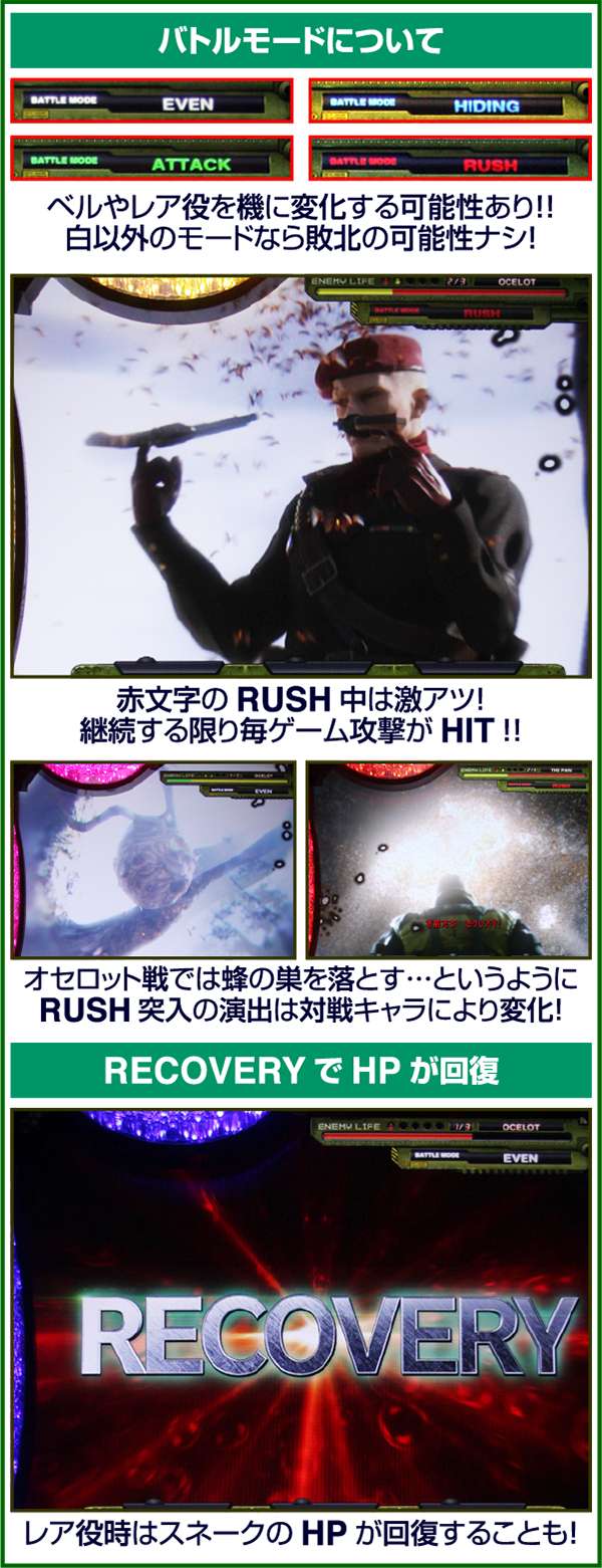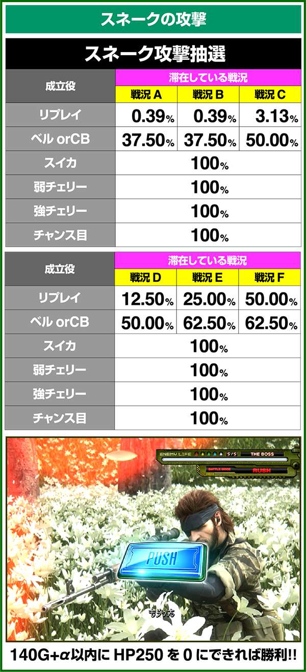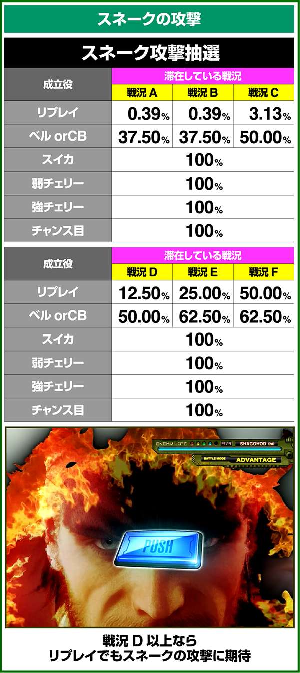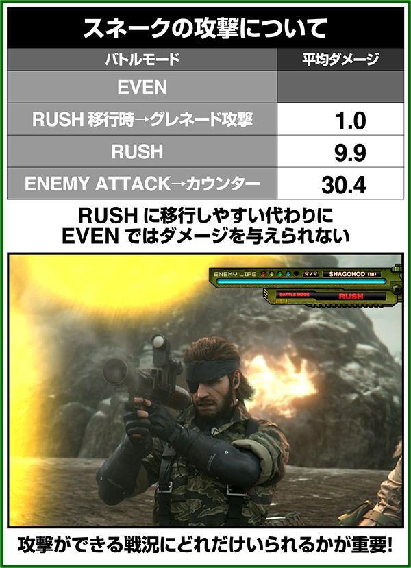 バトルには内部的な「有利」・「不利」という状態があり、まず対戦相手に依存した状況からスタート。以降はベルやレア役を引けば優位な状態に近づき、逆にリプレイが頻発すると不利な状態へ移行しやすくなる。成立役によって綱引きをしているイメージで、有利な状況であればスネークの攻撃機会が増え、リプレイでも敵にダメージを与えることがある。