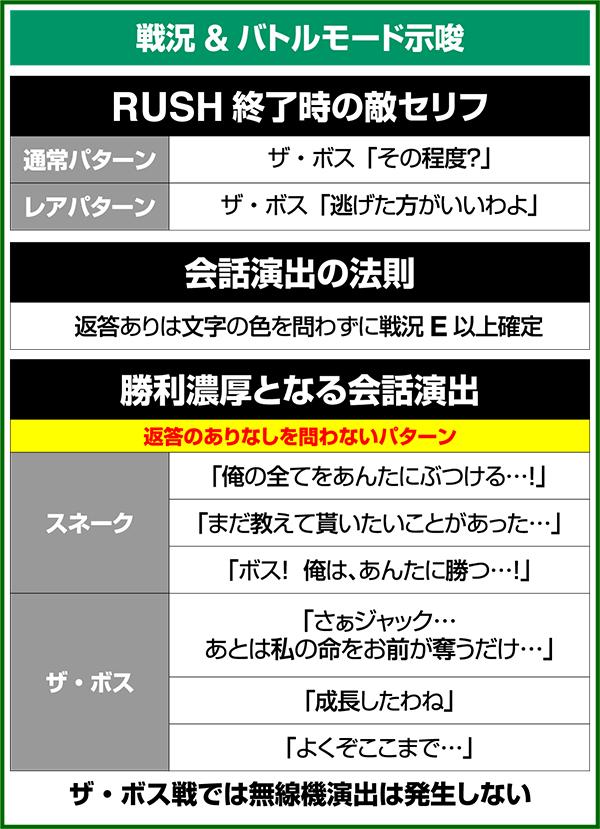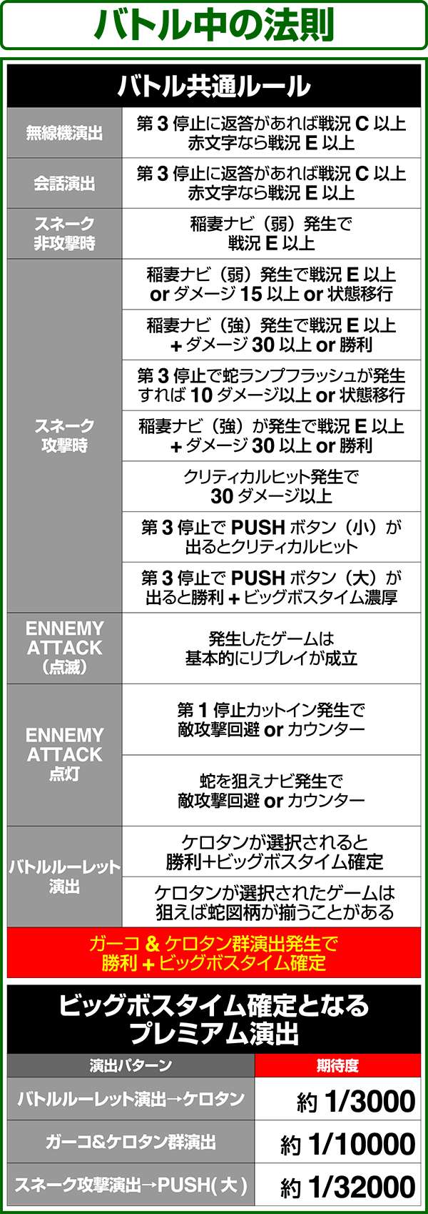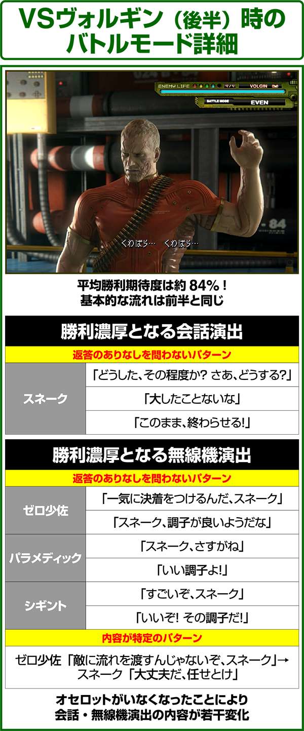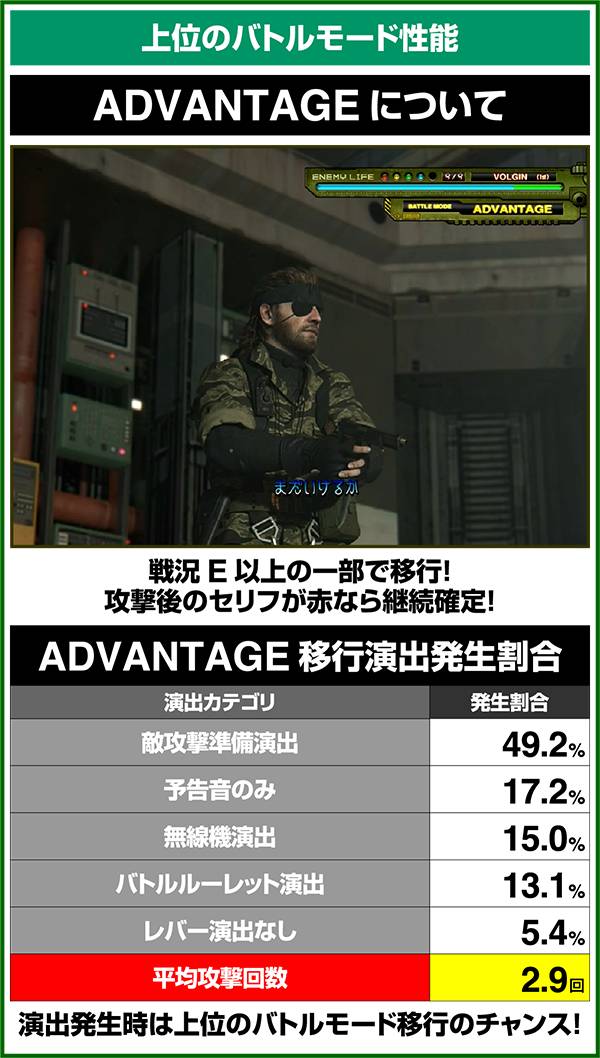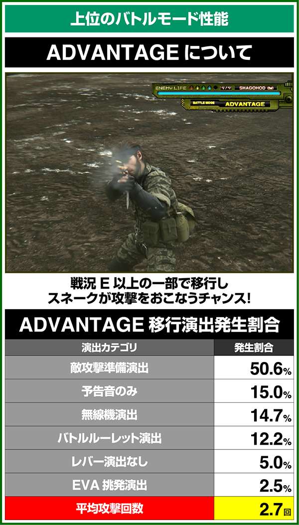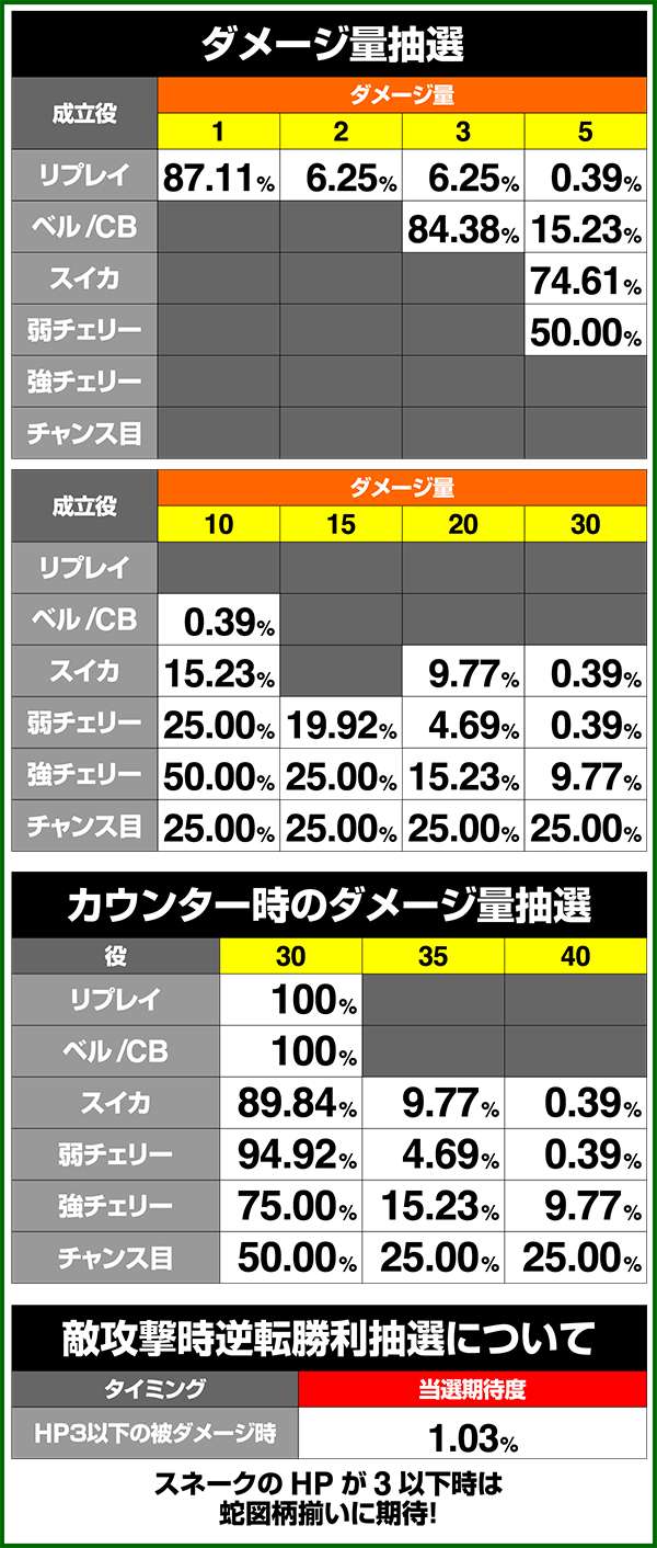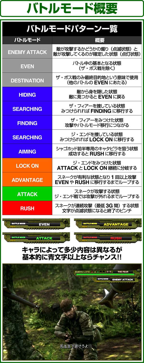 バトルには内部的な「有利」・「不利」という状態があり、まず対戦相手に依存した状況からスタート。以降はベルやレア役を引けば優位な状態に近づき、逆にリプレイが頻発すると不利な状態へ移行しやすくなる。成立役によって綱引きをしているイメージで、有利な状況であればスネークの攻撃機会が増え、リプレイでも敵にダメージを与えることがある。